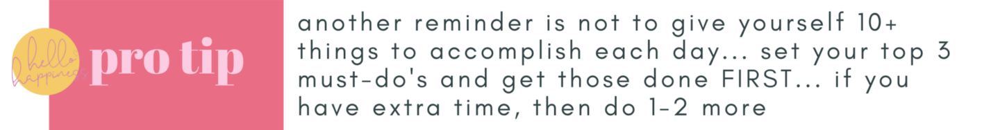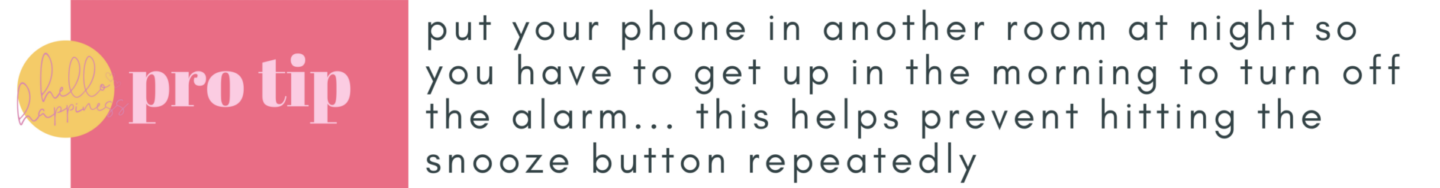 This may sound super simple, but I’m making it the first and most important rule to being productive and that’s setting your alarm for the same time each and everyday. Now I will preface this by saying that I only have mine set for weekdays to rise at 6:30AM, but the girls wake up around that time on the weekends anyways so it’s not like I could sleep in regardless. I promise you, though, that by acclimating your body to get up at the same time each day, you’re setting yourself up for success to get in a good daily routine! But yes, with that caveat also means you need to make sure you’re getting enough rest. For me, lights out each night is 10PM = mama needs her sleep!