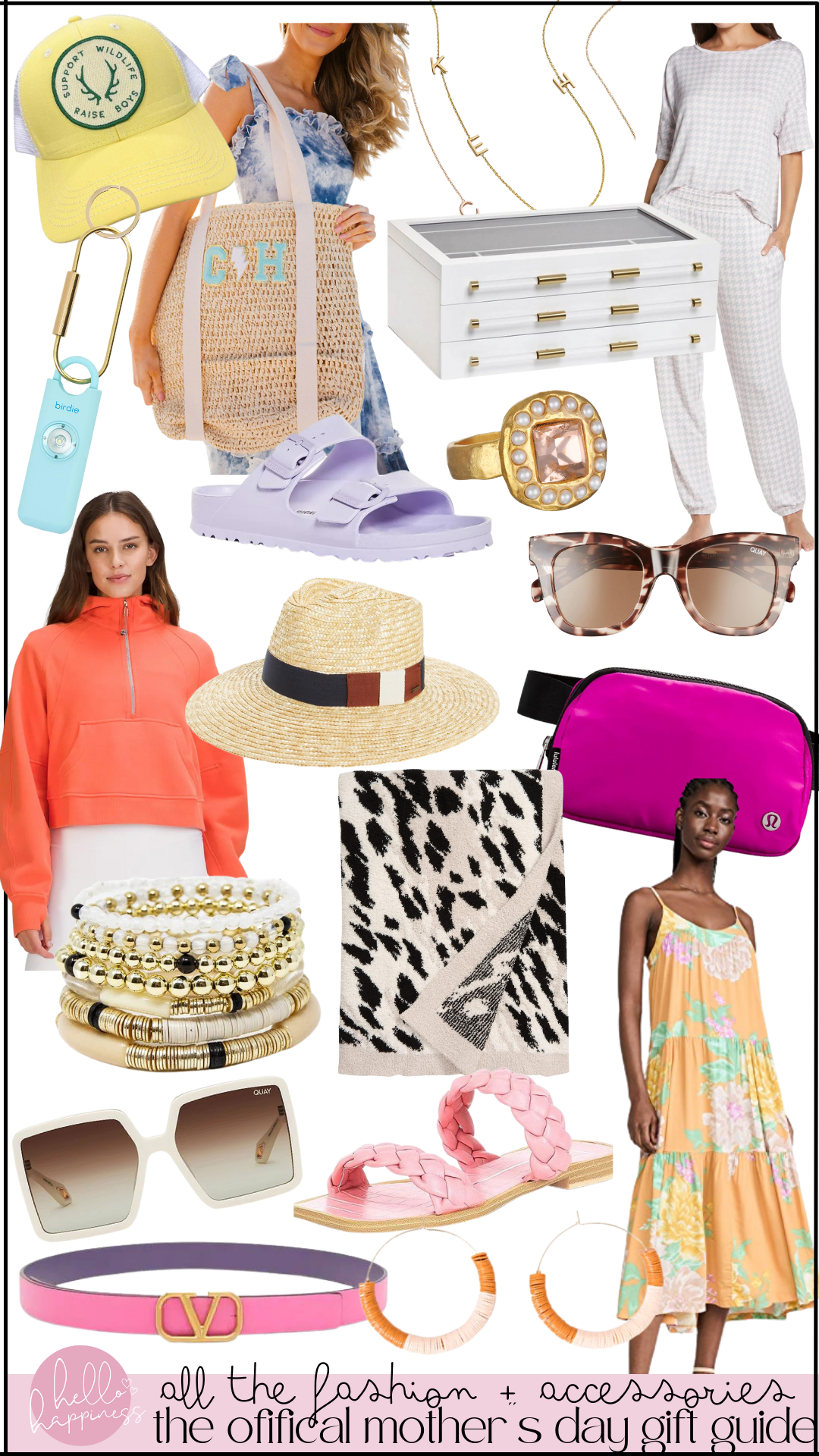 baseball hat | custom straw bag | letter necklace | jewelry box | lounge set| safety alarm | slide sandals | gem signet ring | after hours sunglasses | half zip jacket| straw hat| belt bag| bracelet stack| throw blanket| floral dress | almost ready sunglasses | braided sandals |pink belt| hoop earrings