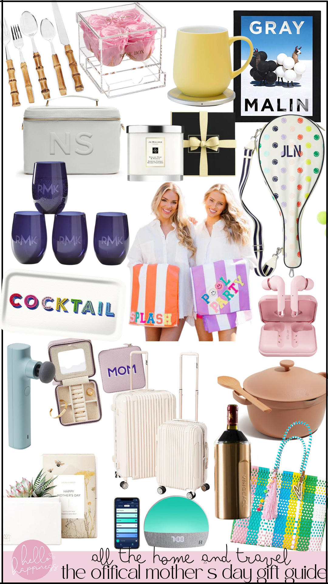 bamboo flatware set |rose jewelry box |mug + warmer set |coffee table book | monogram train case |jo malone candle | tennis racket case | serving tray | customized beach towels | wireless headphones | handheld massager | jewelry case | luggage set | wine chiller | perfect pot | succulent | sound machine | tote bag