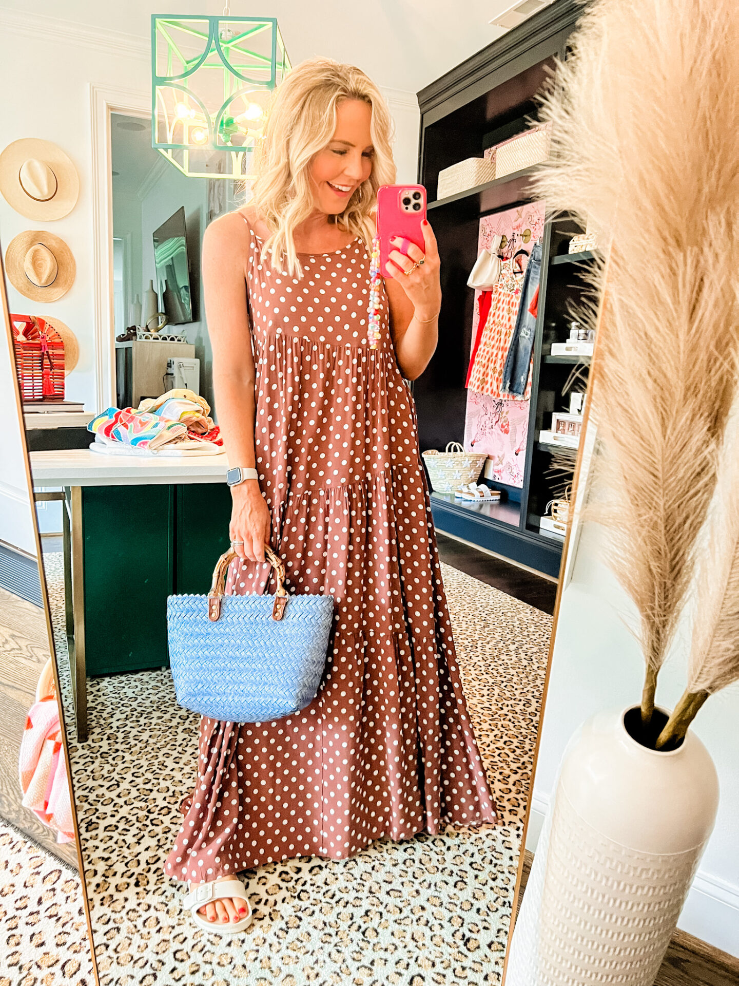Brown Polka Dot Loose Maxi [wearing small/runs TTS/just $37] Go ahead and add this one to your cart friends… it’s a HUGE winner in my book. So nice I bought it twice and you’ll see the second print just a few pics down! It’s loose fitting silhouette is perfect for hot days and will make a great layering style into fall. It features adjustable straps and comes in a TON of colors, too!!