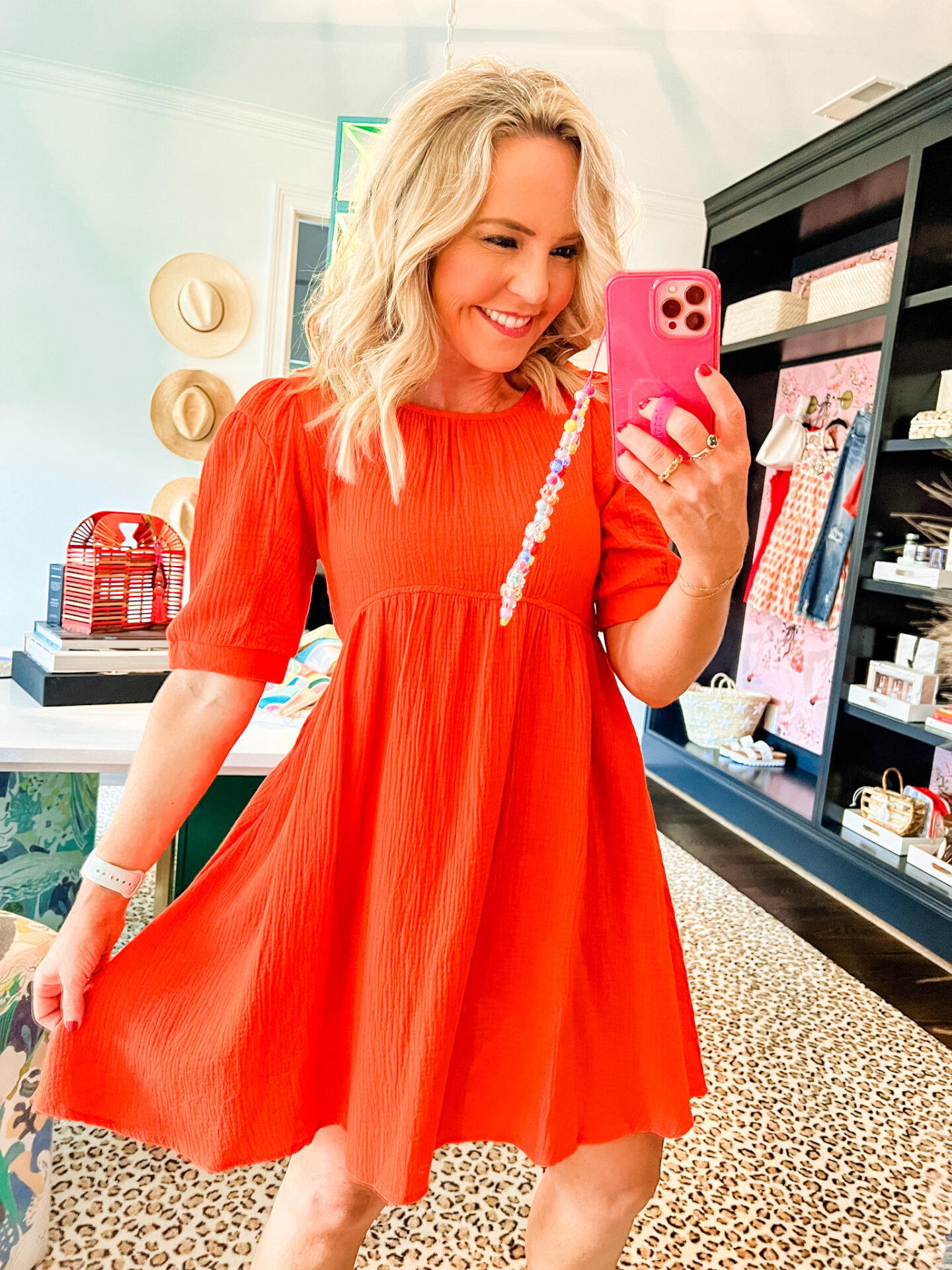 Puff Sleeve Babydoll Gauze Dress [wearing small/runs TTS/only $29] 5 colors in this adorable and oh so soft summertime dress. Of course I opted for the orange because football season is right around the corner!!! The perfect puff sleeve detail, empire waist and casual, easy breezy styling.
