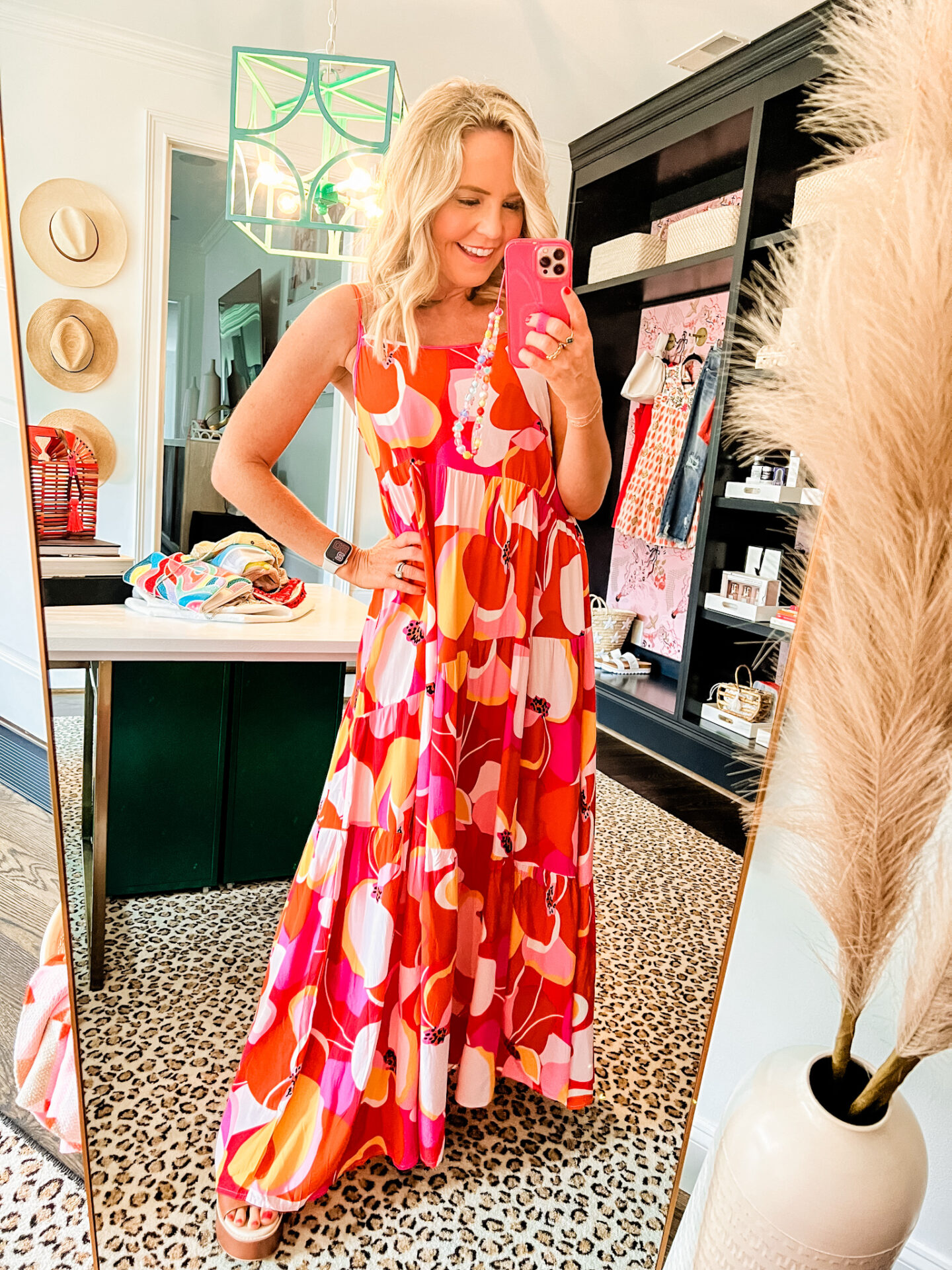 Printed Maxi Dress [wearing small/only $38] this printed maxi is all things flowy, floral, and fabulous!! I was so impressed by the quality and fit of this piece for under $40!! the pink/orange/yellow color combo is perfect for summer and the easy throw on style is ideal for a no fuss outfit at home or on vacay. it has a tiered skirt and adjustable spaghetti straps. you’re gonna want to add this one to cart asap!
