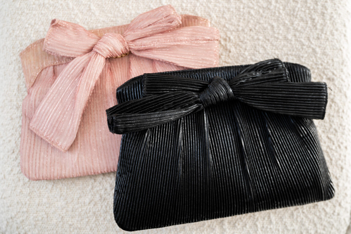 Violet Bow Clutch in Rose Gold + Black | $58 The designer look for WAY less… I’ve been sourcing these bags for months, trying to find the perfect ones and we finally made it happen, not only in classic black but in a gorgeous rose pink colorway as well. A great clutch with a simple close top AND a gold beaded strap to make it a crossbody bag!