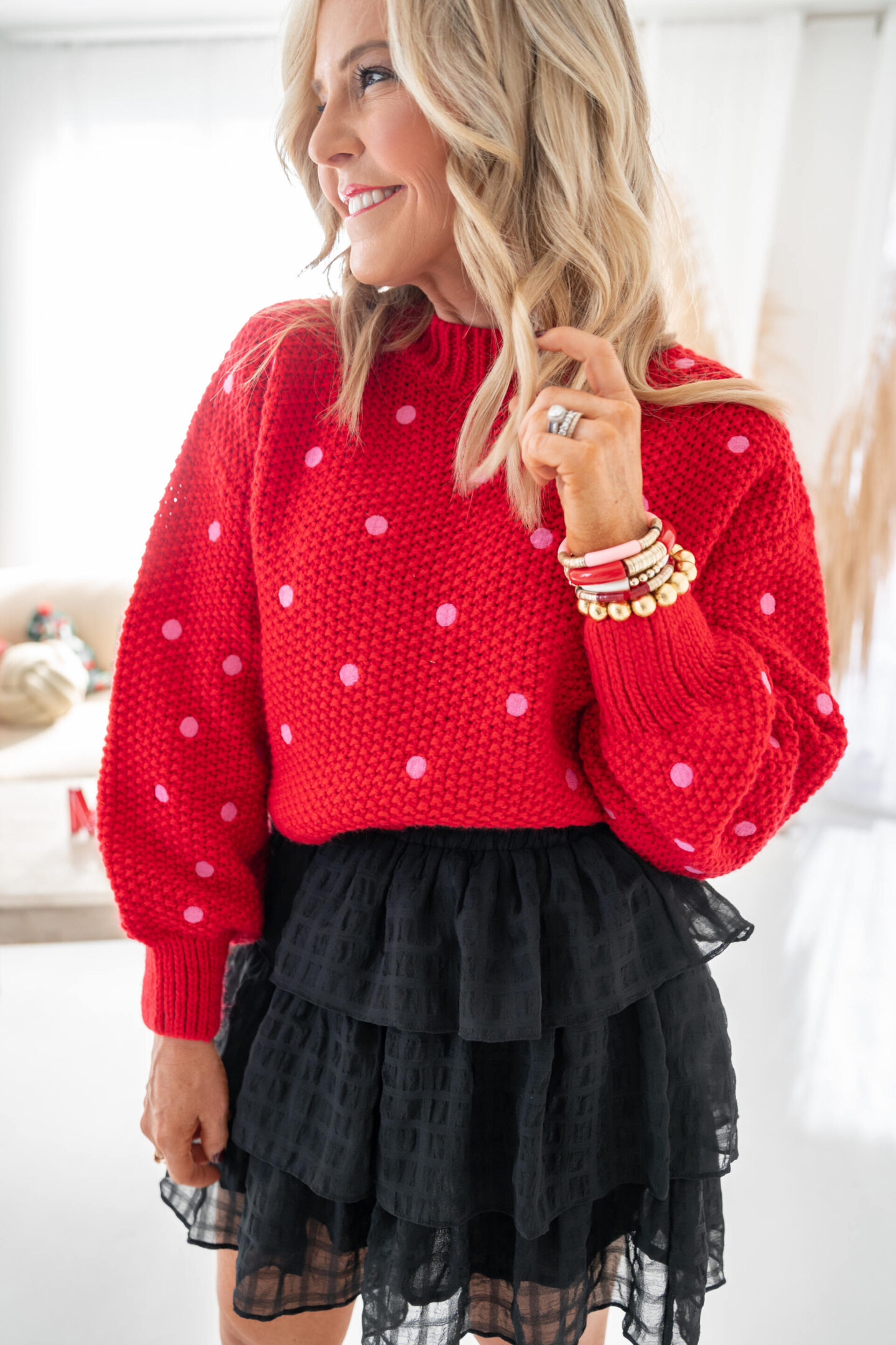 Ava Kate Sweater $78 | [wearing XS] Starting things off with this showstopper sweater is hopefully just what you had in mind!! What a perfect combo… red + pink perfection in a warm knit fabrication, slightly cropped styling and of course the embroidered all over dots = dress it up with the Avalon Skirt like I’ve done or wear it a bit more casual with denim and slip-ons. So versatile for the holidays AND into Valentine’s too!