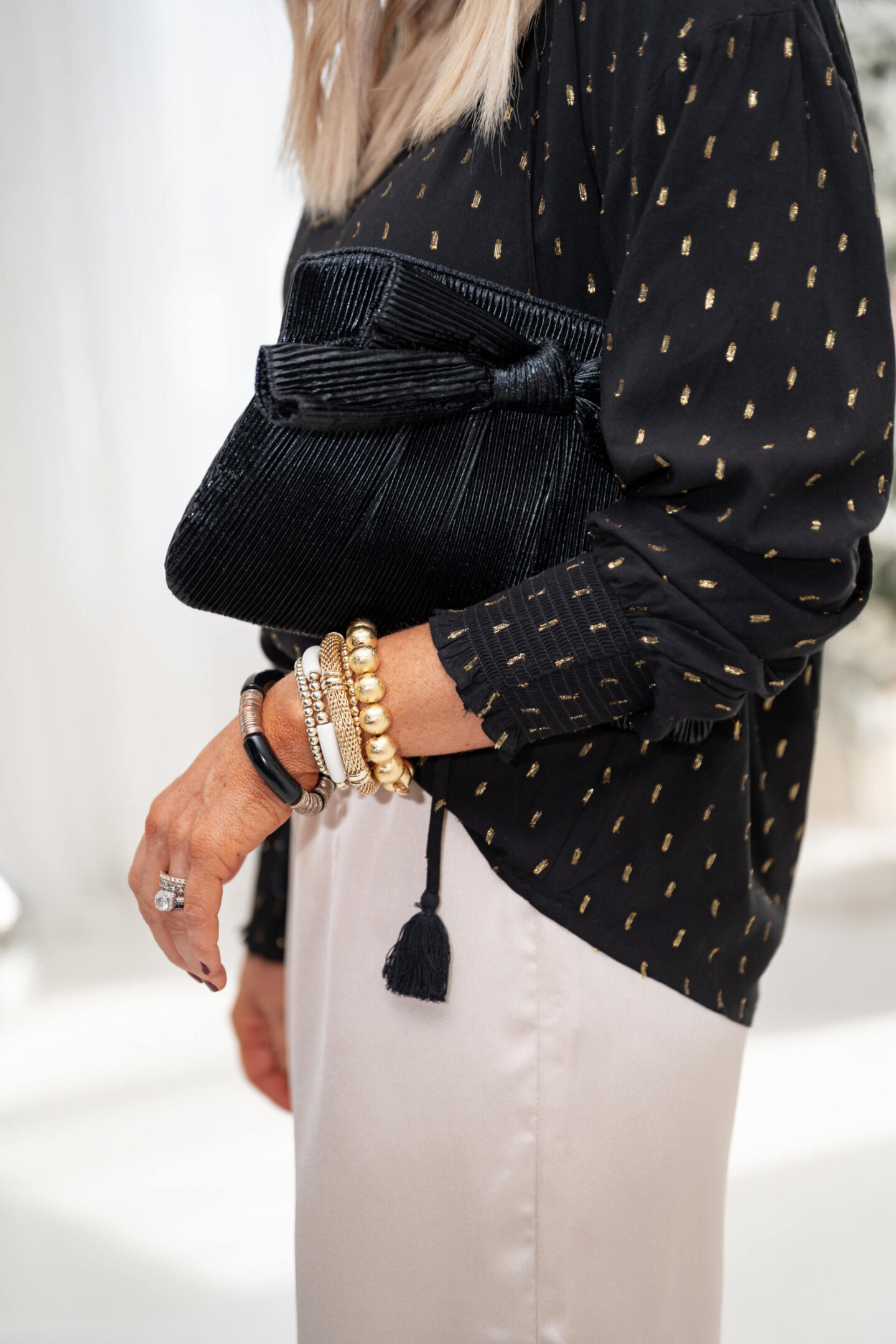 Kathryn Top $72 | [wearing XS] Next up, let’s move onto a little pop of gold + black for this season’s festivities to make everything better and bolder! This gorgeous pullover blouse features subtle gold metallic embroidery throughout as well as a split neck design complete with tassel tie strings and a relaxed fit with smocked cuffs + balloon sleeves for extra feminity.