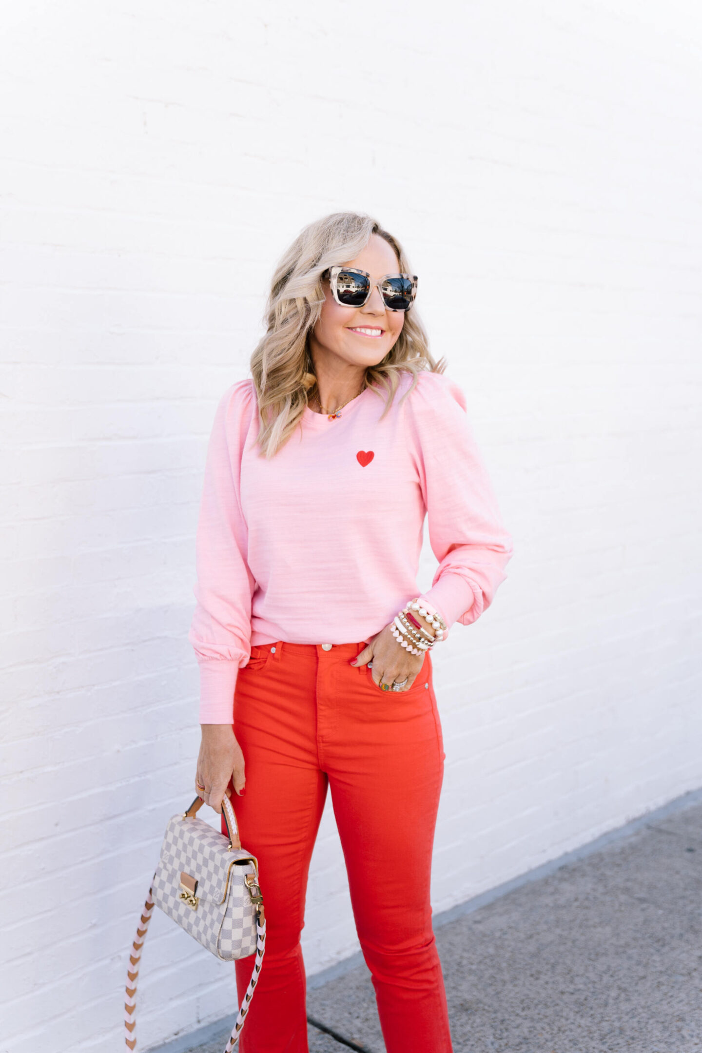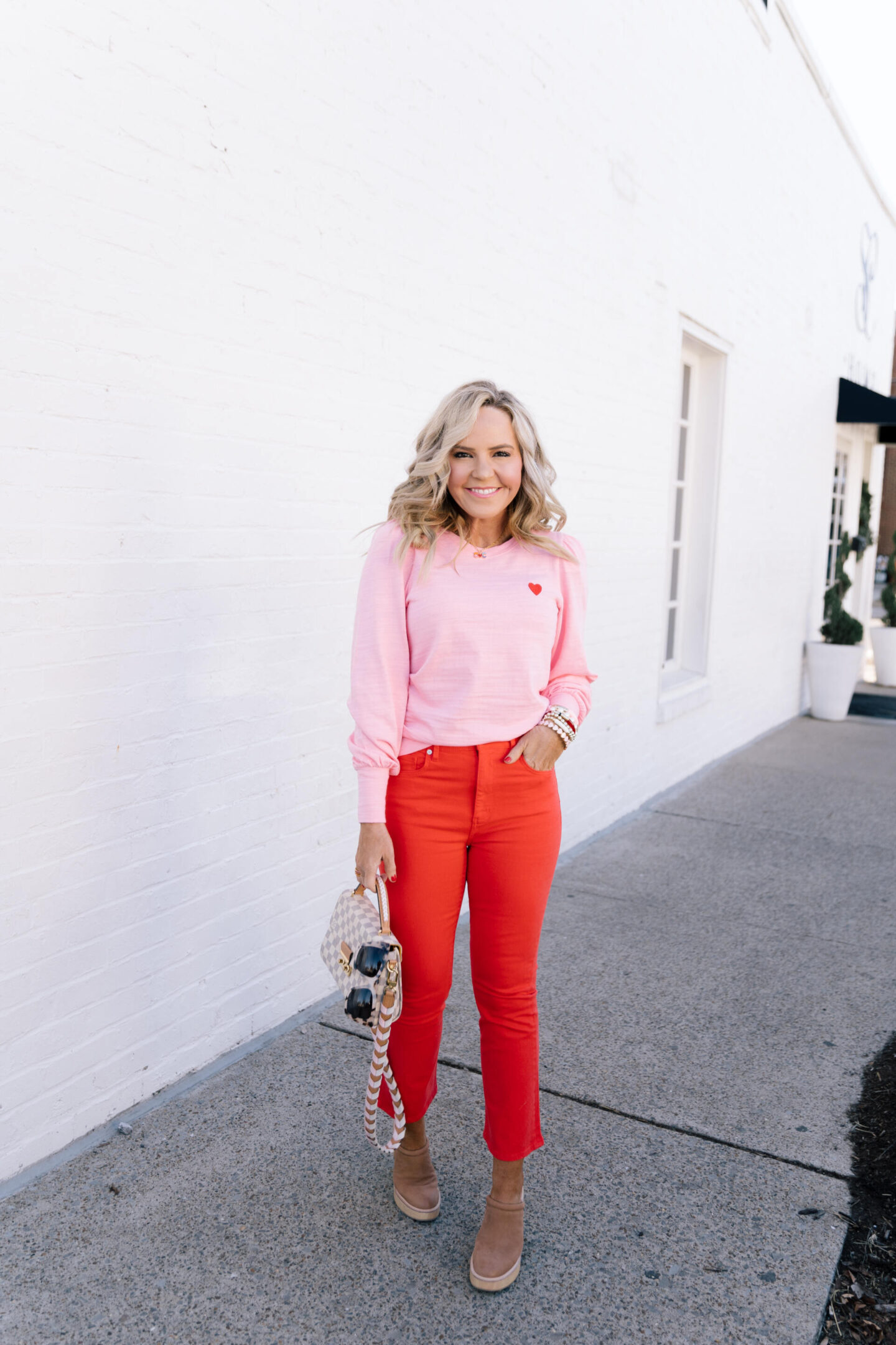 heart puff sleeve sweatshirt | Pretty in pink with a puff sleeve detail you can’t live without! A sweet and simple sweatshirt style in a soft knit cotton fabric embellished with a printed heart detail at the bust. I love how this pairs with these bright red pants but you could easily pair this with your favorite skirt, regular denim, or flare leggings for a casual look. [wearing XS]