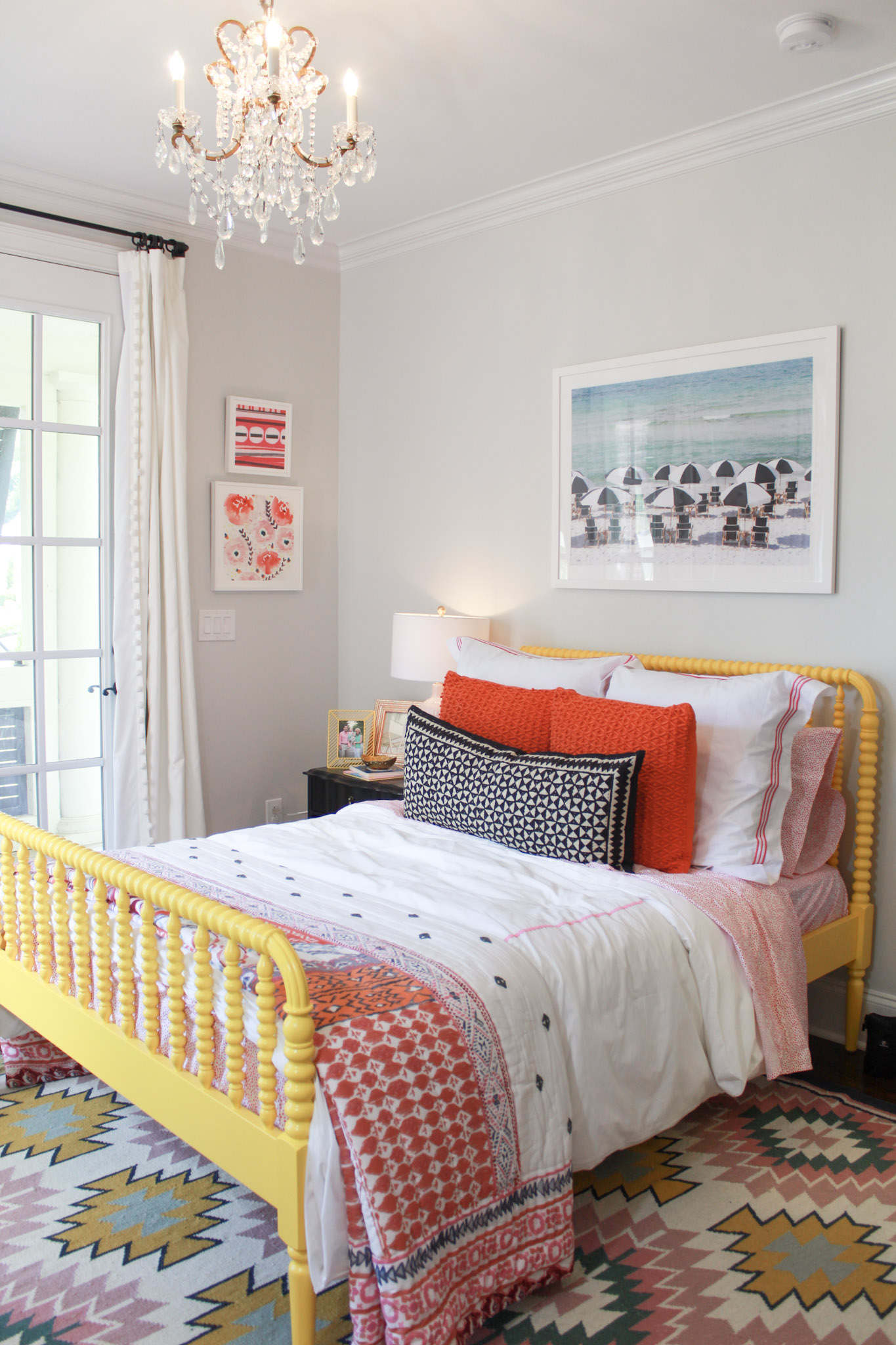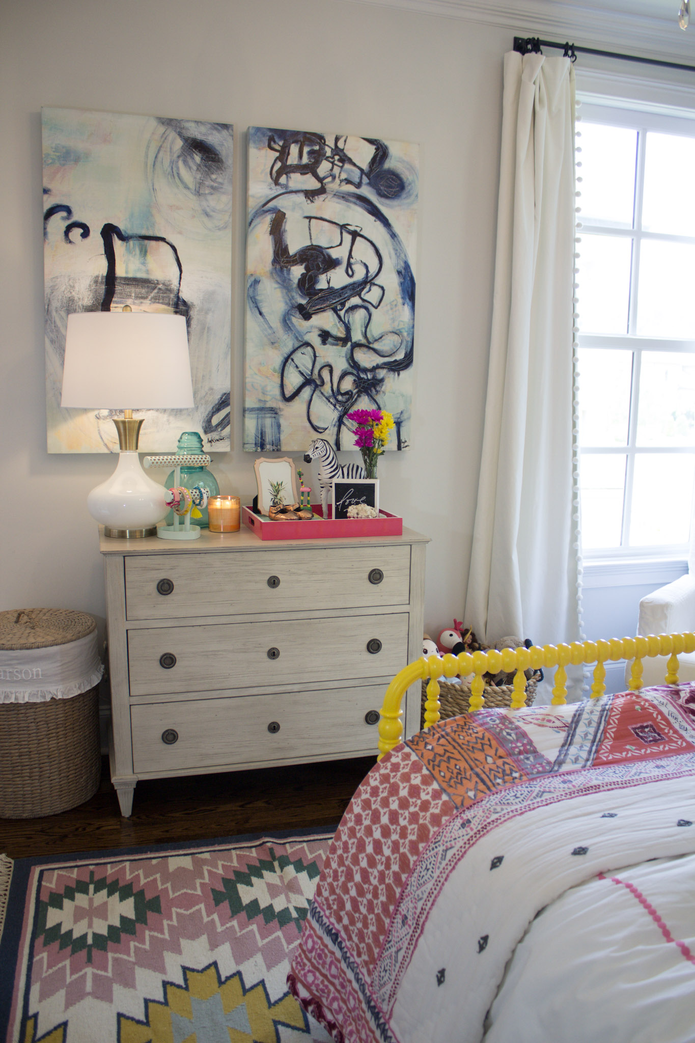 If you’re new here, you can see her original “big girl” room reveal here back in 2017. She was all things obsessed with yellow at that time, which is why we went bold with her bed and it’s still one of my most favorite components of her room. However, she said she really wants an upholstered bed, so we will see what we come up with. It’s also officially time to bid adieu to her glider, the giraffe bust, and she wants to paint some original art with my friend Kelly Terrell Art like her big sister, too.