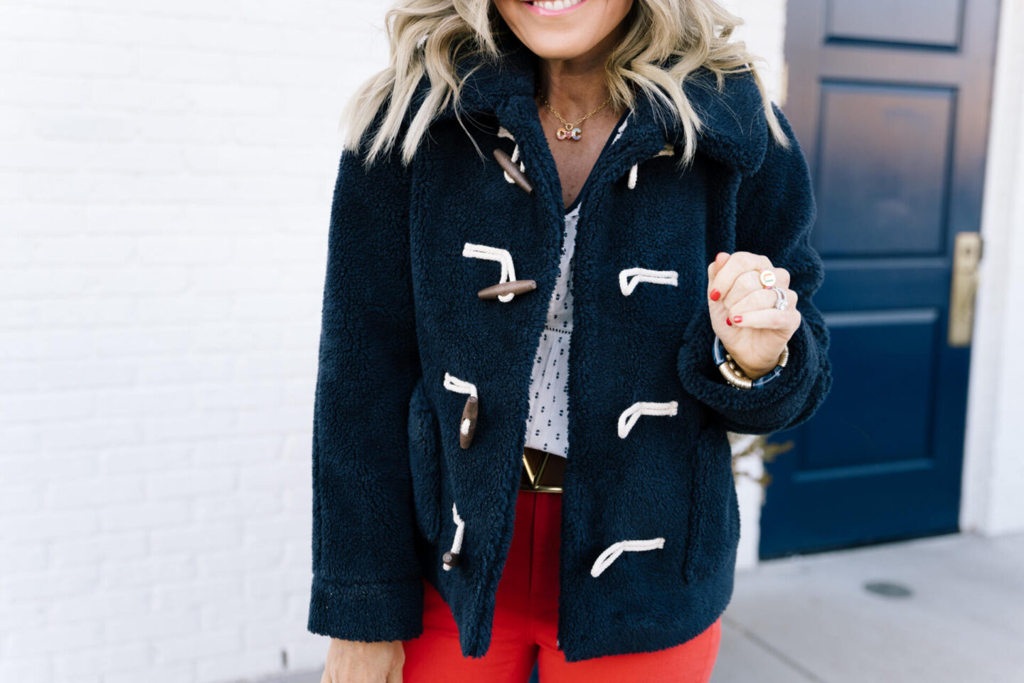 Finally, if you’re looking for a late spring sherpa situation, this Toggle Jacket will keep you warm well into February and beyond. Make it polished, but cozy = another soft finishing layer!! It’s 40% off [gosh Loft does it right with sales] and I just adore the oversized toggle closures with rich navy background and the cropped silhouette. [runs TTS/wearing XS]