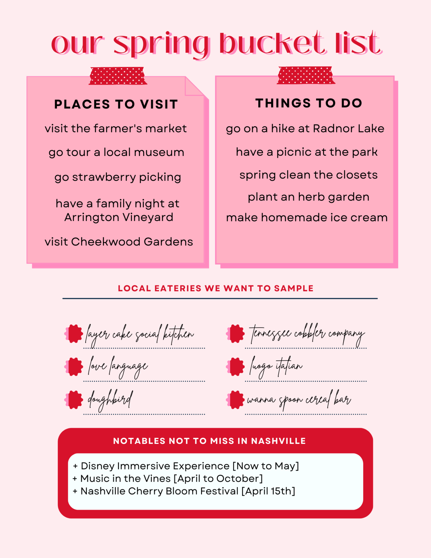 If you’re like me, you can’t remember half of the events and activities going on in your city when the time comes, so I thought to help myself acclimate to the warm weather fun and share some with you, I’d make a proper spring bucket list for us all to enjoy!