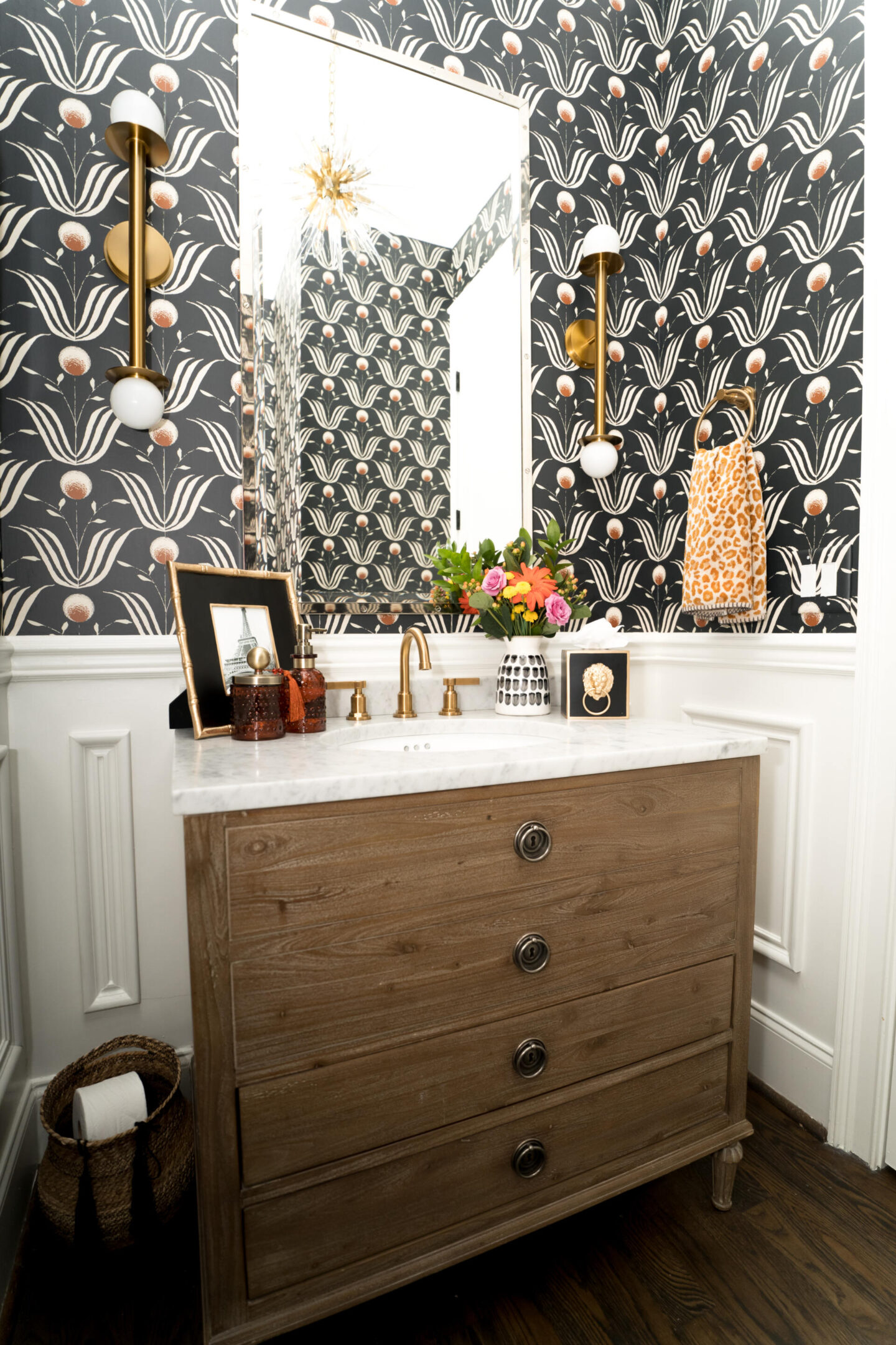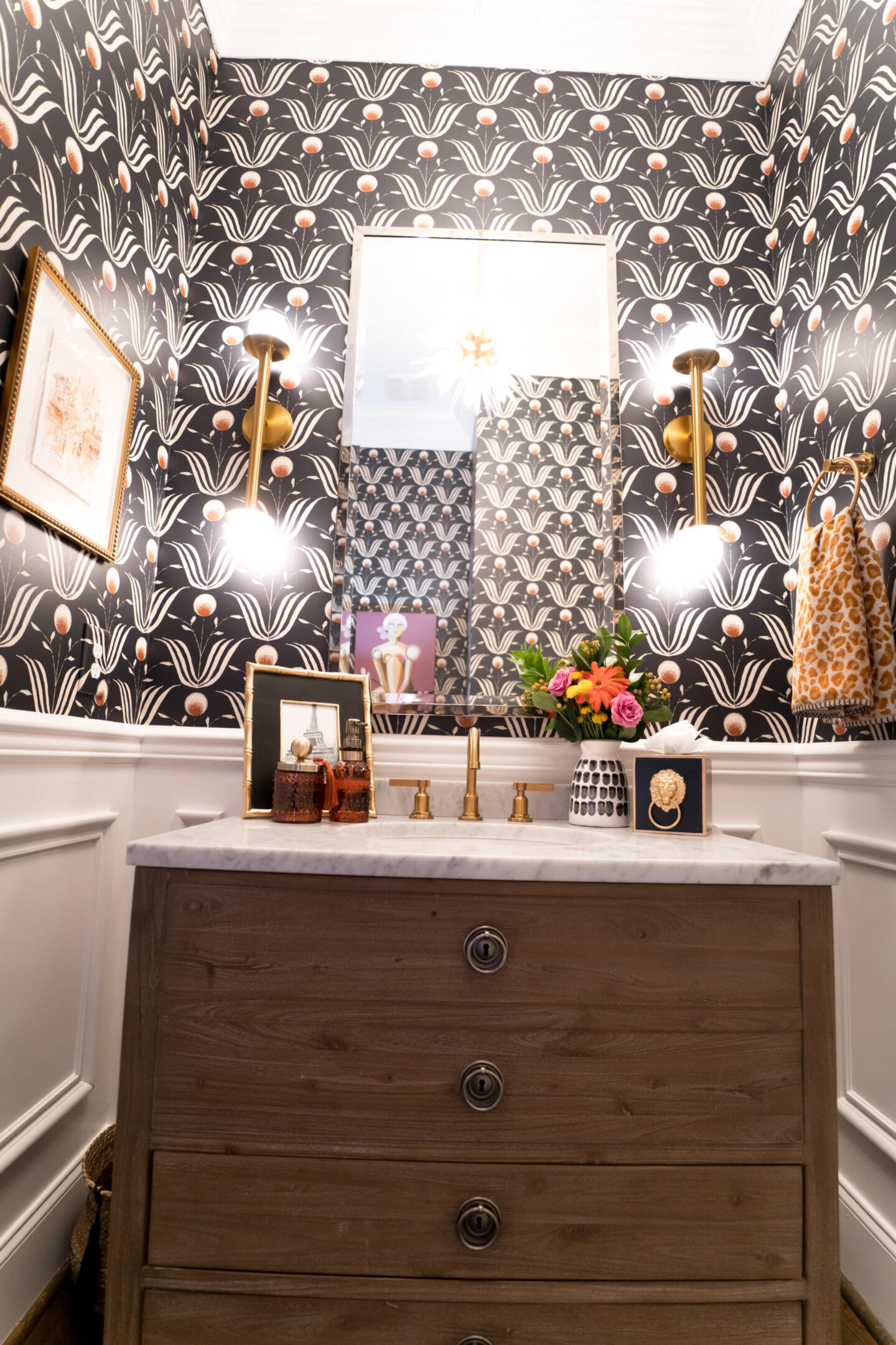 Another design detail we were able to keep is the wainscoting on the lower half of the powder bathroom wall… this definitely helps to break up the pattern of the wallpaper + adds some visual perspective as well.