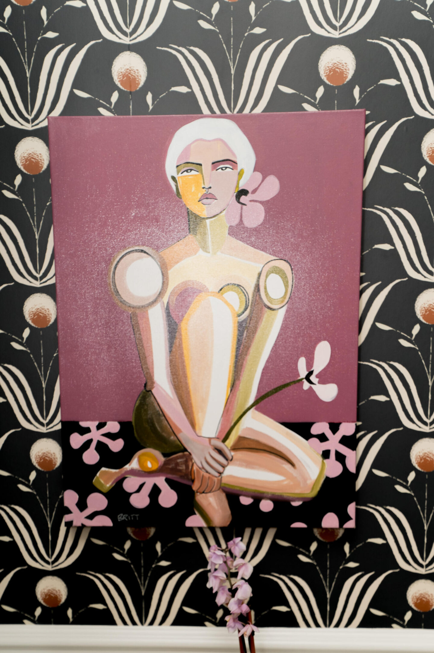 And then the very last detail is this custom commission from the one and only Brittany Atkinson. She is known for her gorgeous feminine figures and this acrylic on stretched canvas was perfect the way it came. I adore how she incorporates purple + pink tones into this beauty and of course the accents of yellow + gold tie it in perfectly with the bathroom design.