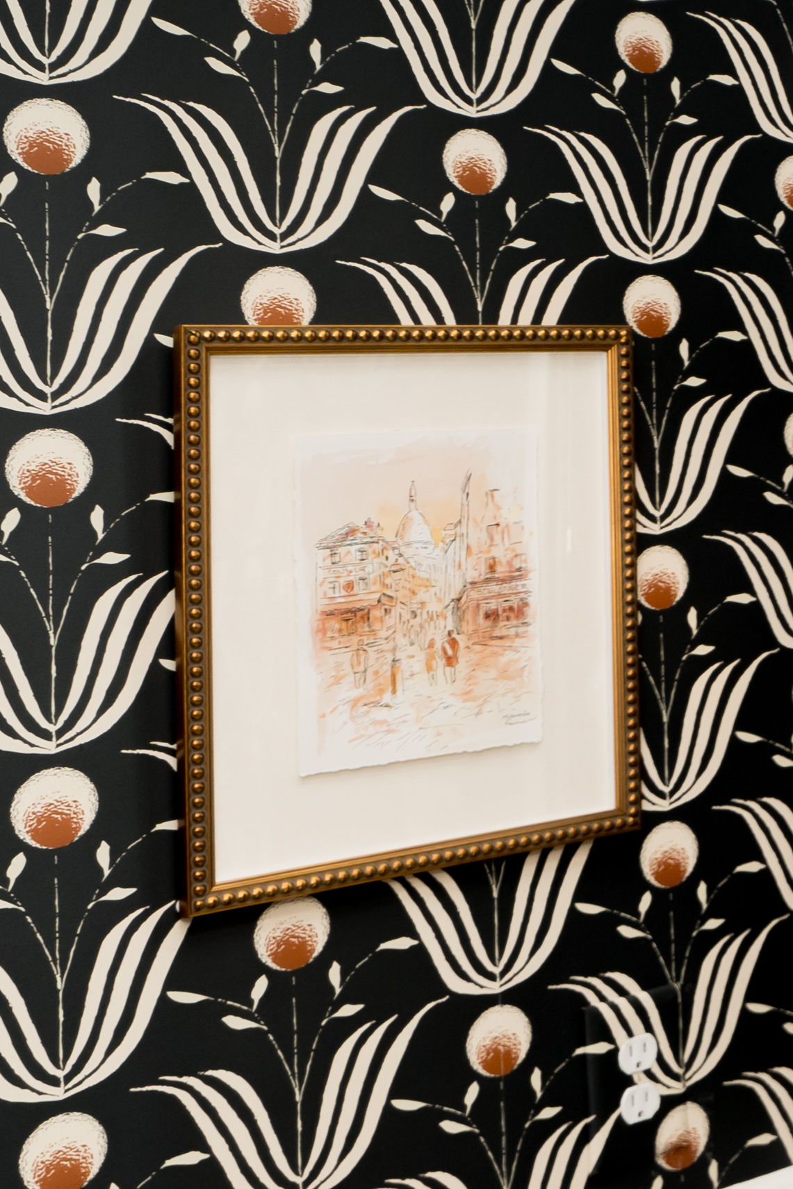 Finally, the bow on top of any space?? The art! One of my favorite details to incorporate was one of the original watercolor paintings we purchased on our Paris trip last spring in Montmartre, a tiny village known for its daily art pop-ups and then I went to my favorite local shop, Anne the Framer, to finish off the piece with its proper matte and brass frame.