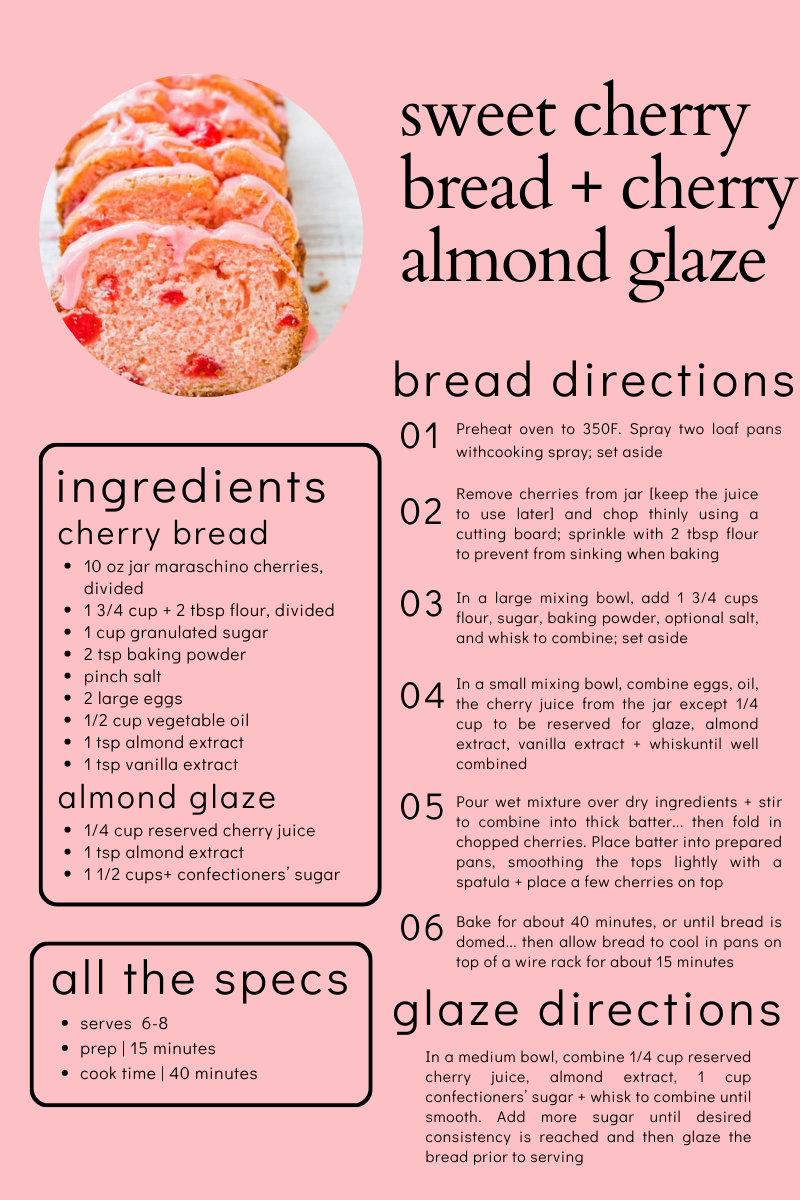 I had pinned this recipe years ago and knew it was the perfect item to add to the auction. A sweet cherry bread + almond cherry glaze = the perfect spring treat for all the parties, showers and daytime events coming up.
