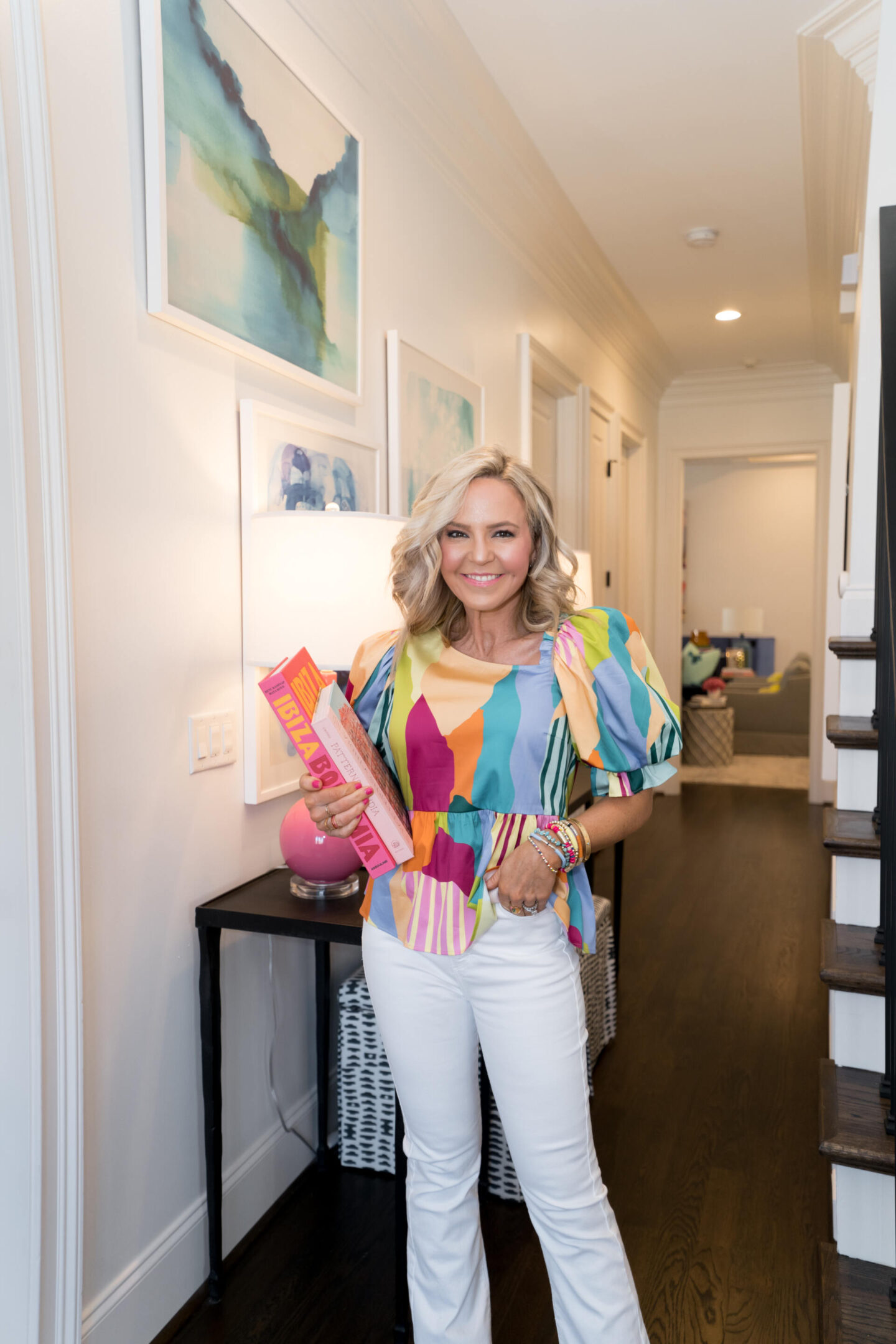 Once you step inside our foyer, you’ll see bright white walls adorned with fun abstract art and then of course a console table with a few of my favorite things to welcome you the best way we know how… colorful + happy. That way you get a little sneak peek of what’s to come throughout our home.