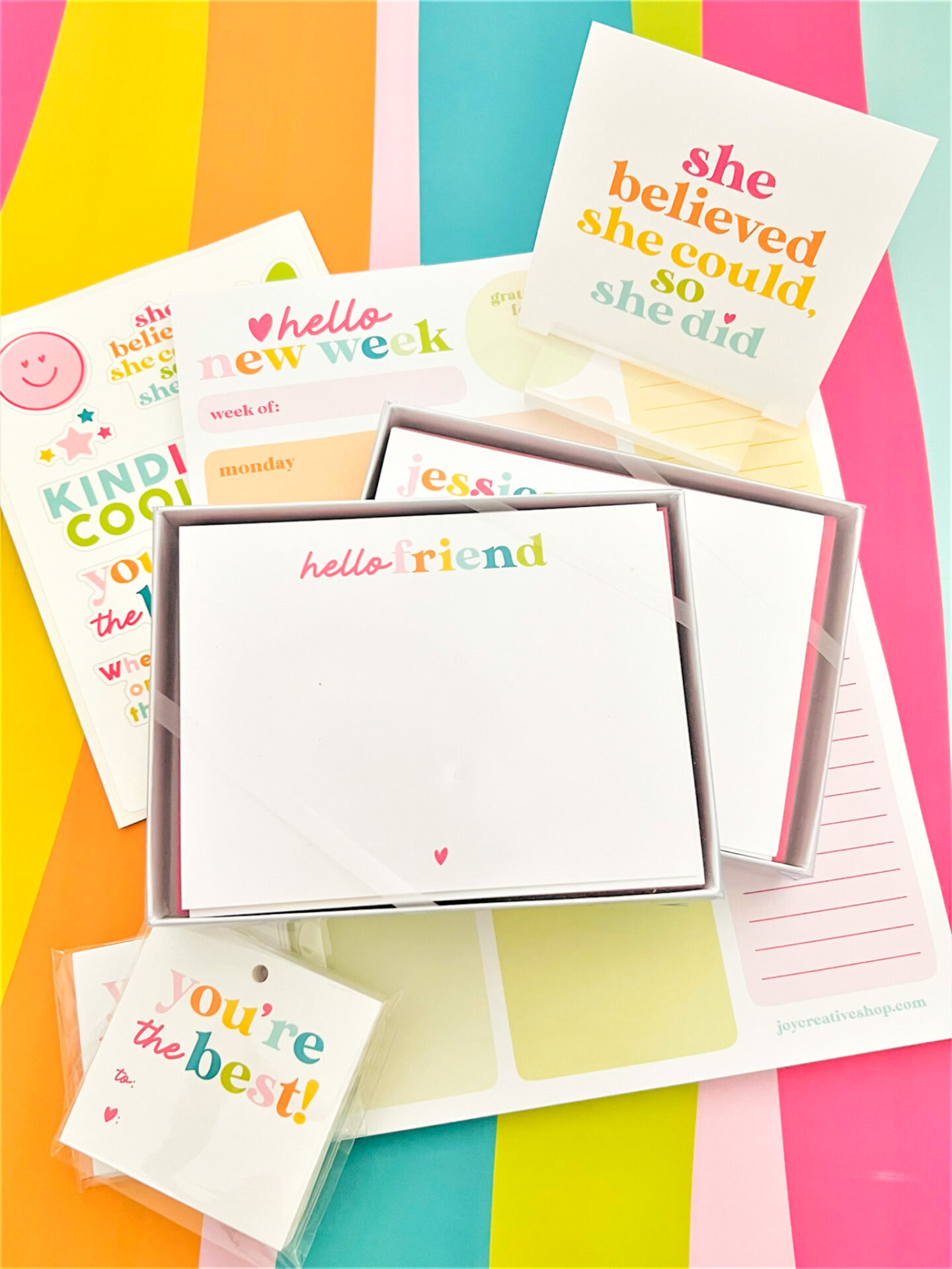 Weekly Notepad | Did she save the best for last?? I think so!! Set your week up for success with this all new colorful, yet coordinated notepad. Not only does it have placeholders for writing all the daily to-do’s, but it also features spaces to write what you’re grateful for and other not-to-forget items. And of course we accented it with all the colorful hues from this collection so you’ll stay in the know while making your workspace pretty, too. Size 8.5″ x 11″/50 pages/packaged in a cello bag, perfect for gifting