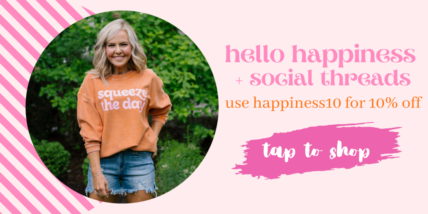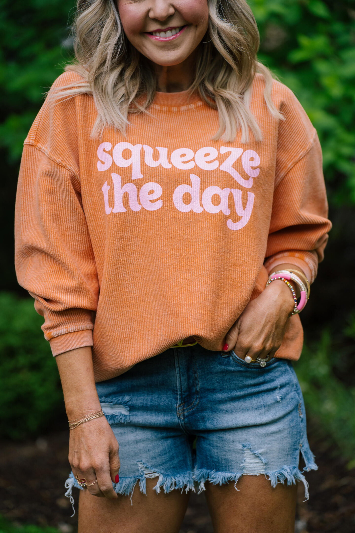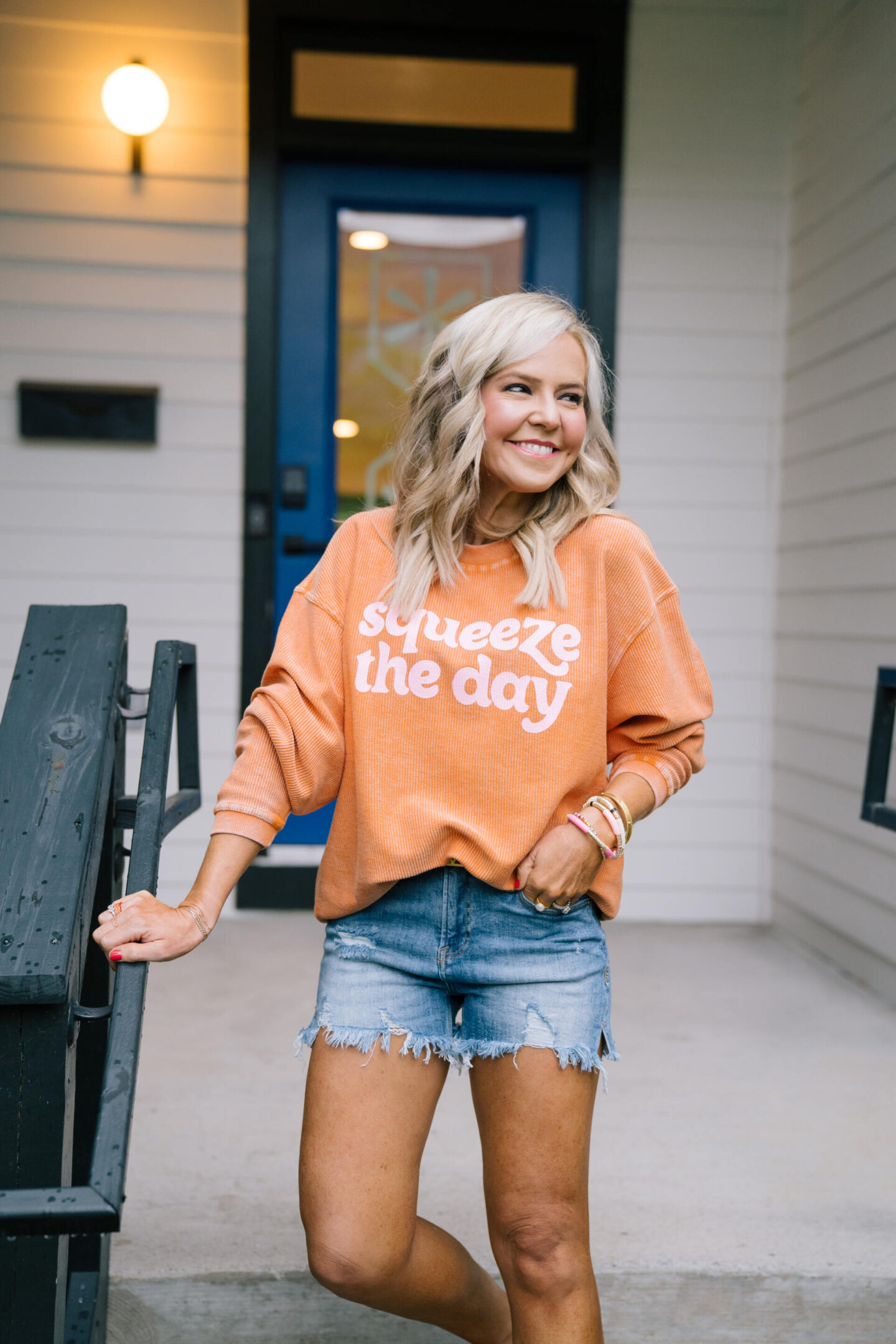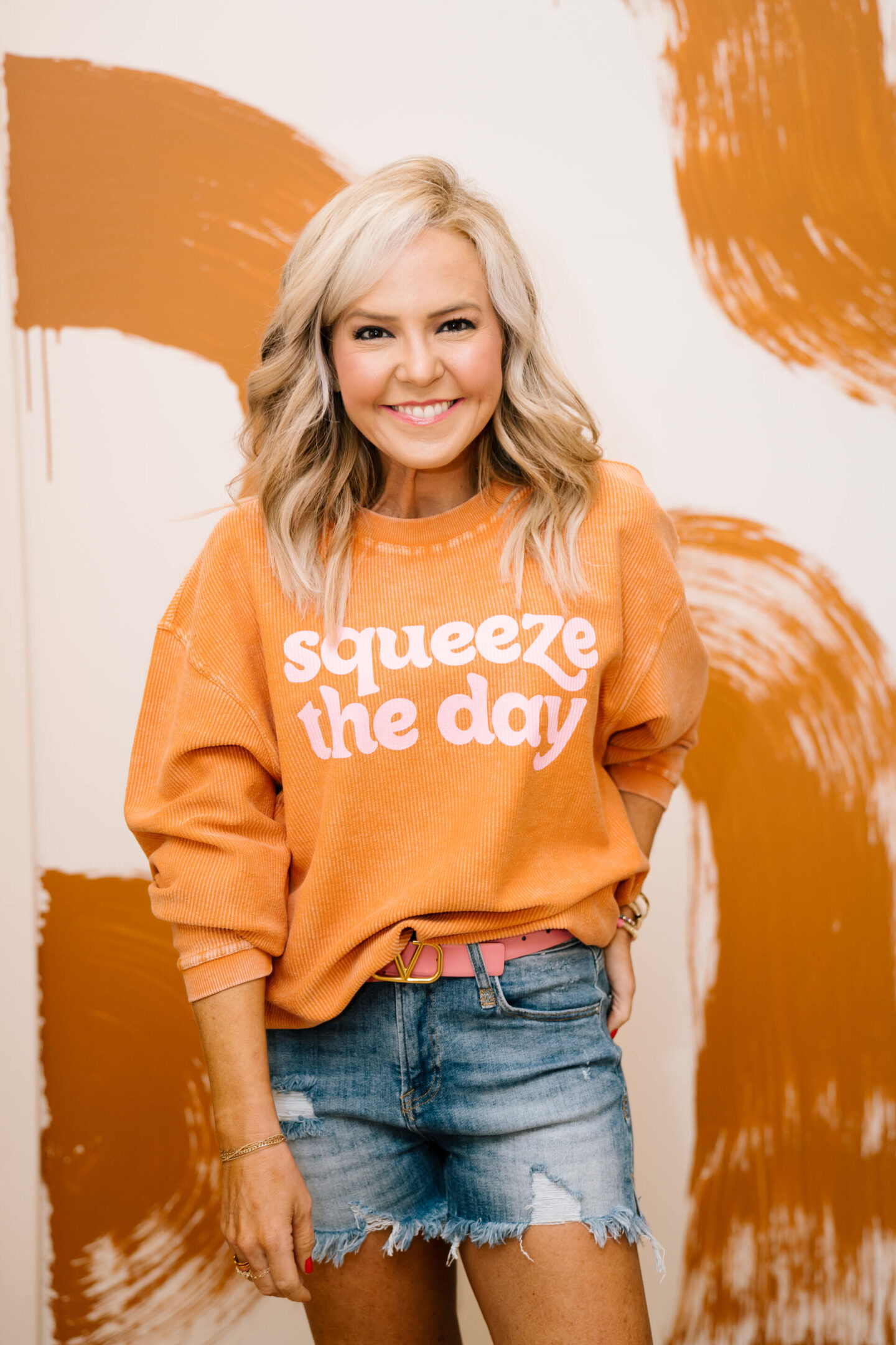You know I’m the positive quote and daily affirmation queen, so it should come as no surprise that we decided it was high time to create something cute and perfect for summer adventure… whether you’re jet setting across the states and need a travel top worthy of a plane nap, rocking evening sunsets on the beach while listening to the waves, or maybe even on the water for an early morning lake ride on the boat, it’s time to SQUEEZE THE DAY and get the most out of life. Basically, it’s the southern way of saying carpe diem!