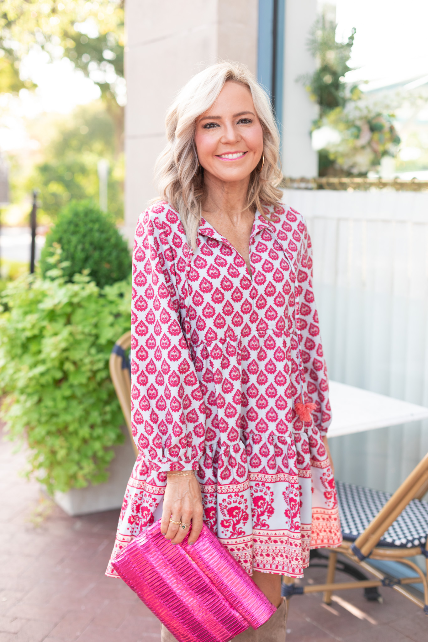 Perfectly patterned in so many bold hues for fall = this colorful explosion with its empire silhouette and tassel tie detail is a feast for the eyes. Crafted from lightweight fabric, it’s perfect for layering up with your favorite denim jacket! Calling it now, this one will sell out FAST because of the cuteness factor and the fabulous price. [available in sizes small – large $59]