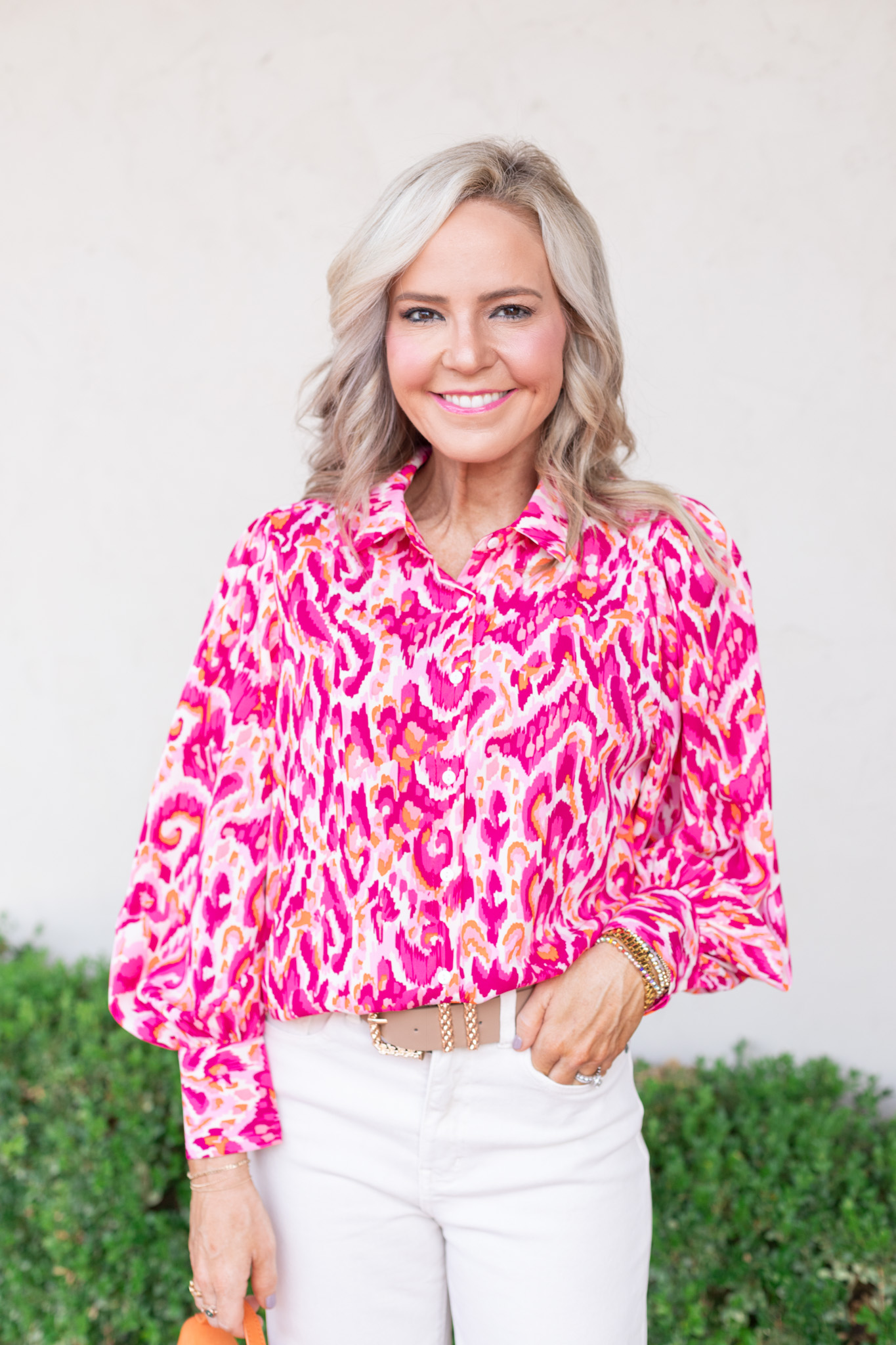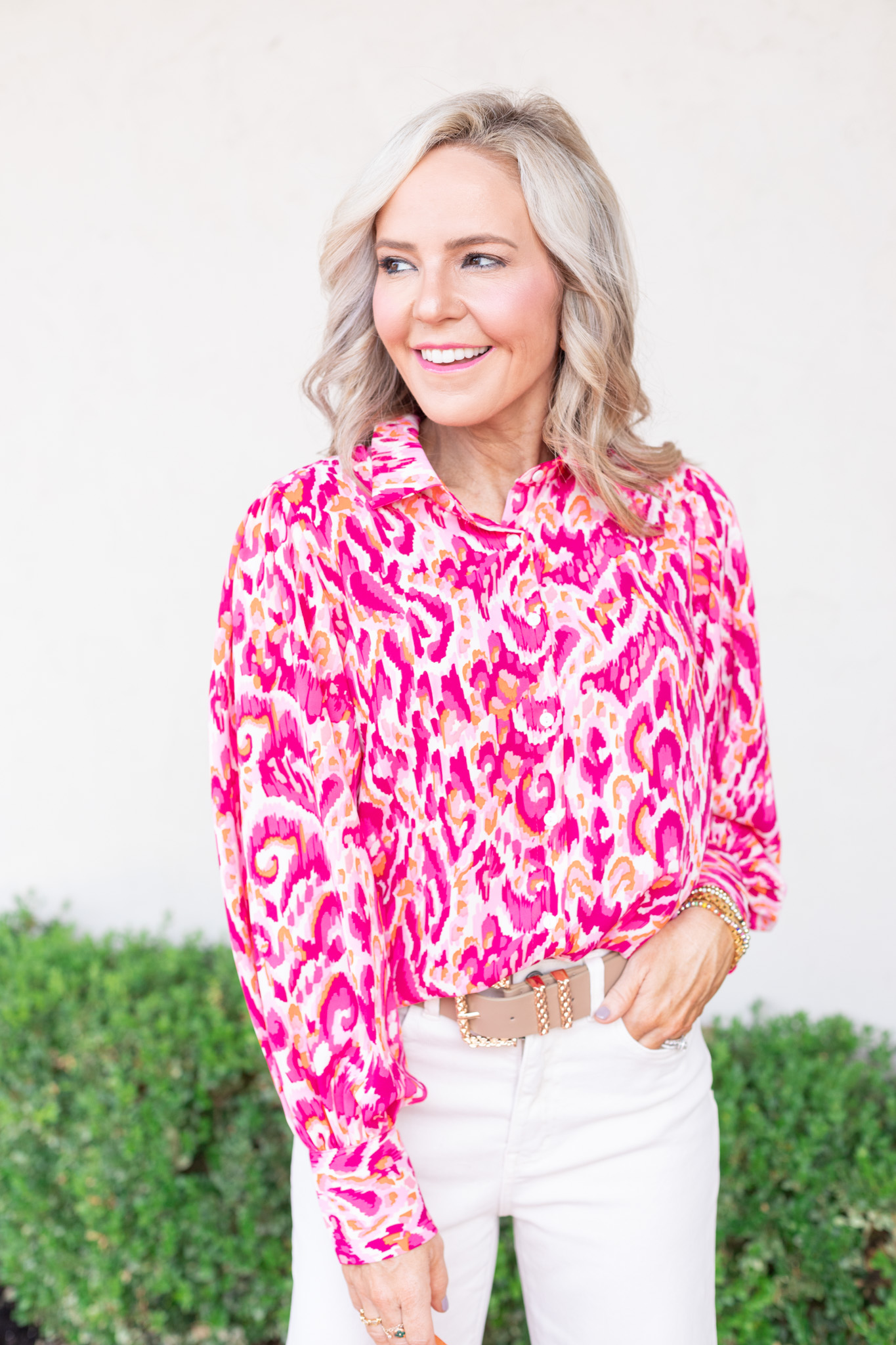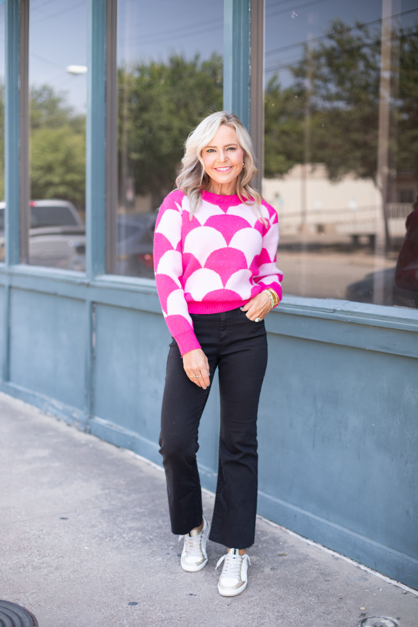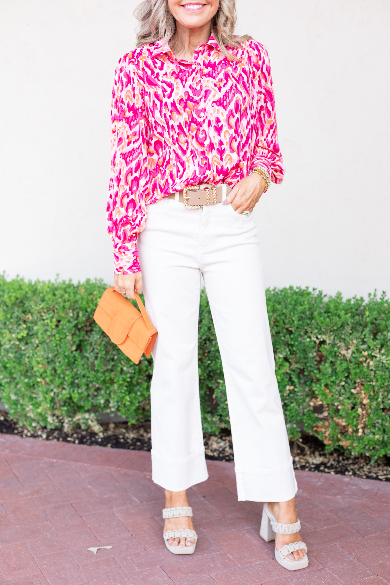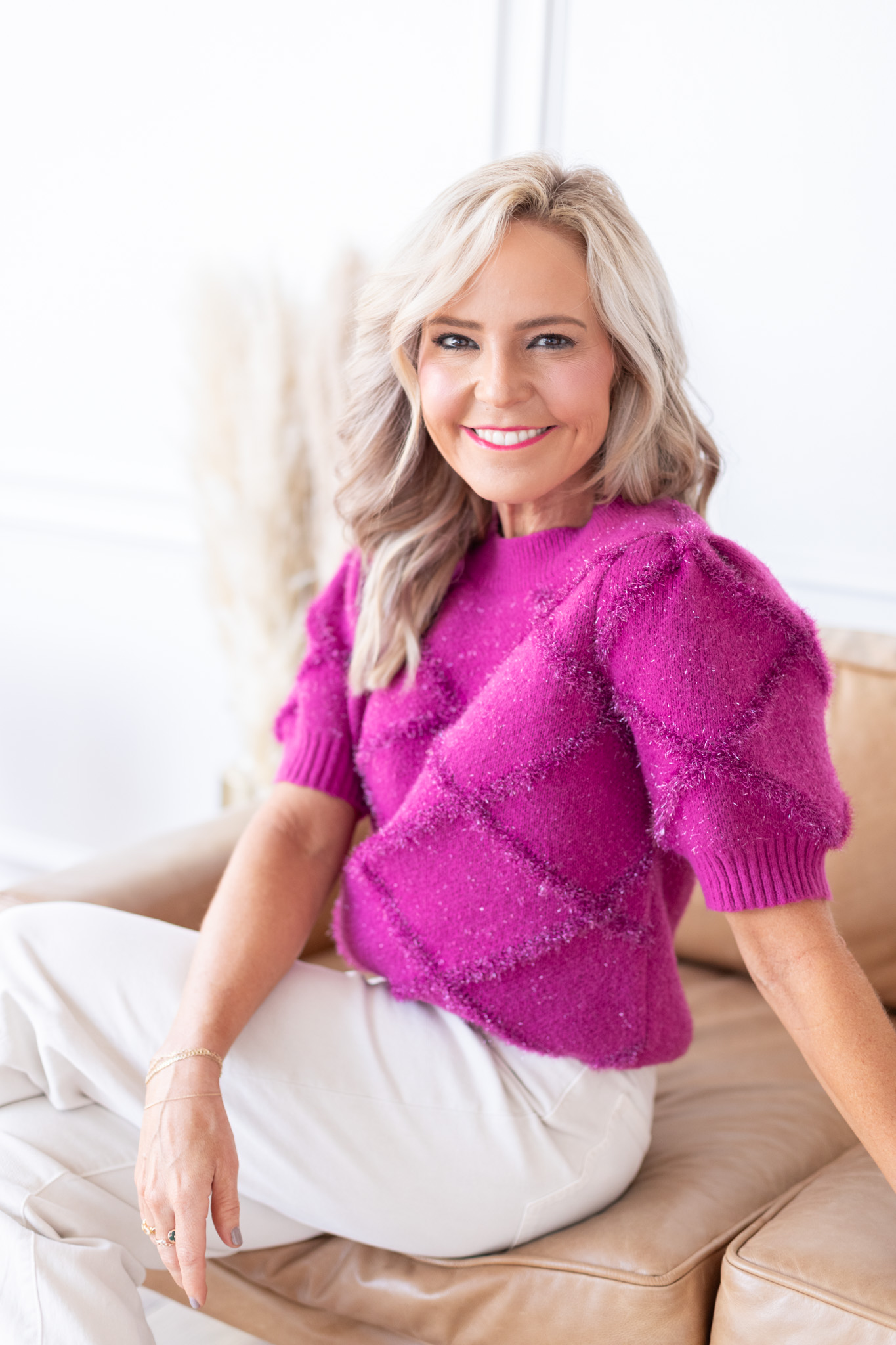 Magenta magic… have you ever seen anything sweeter?? I knew I wanted to incorporate short sleeve sweaters in this collection because I live in the south and we are ready for sweater weather, but still want to take note of our ever-changing forecast. This statement sweater will become a fav no doubt, with its shimmer detail and slightly oversized silhouette. [available in sizes small – large $49]