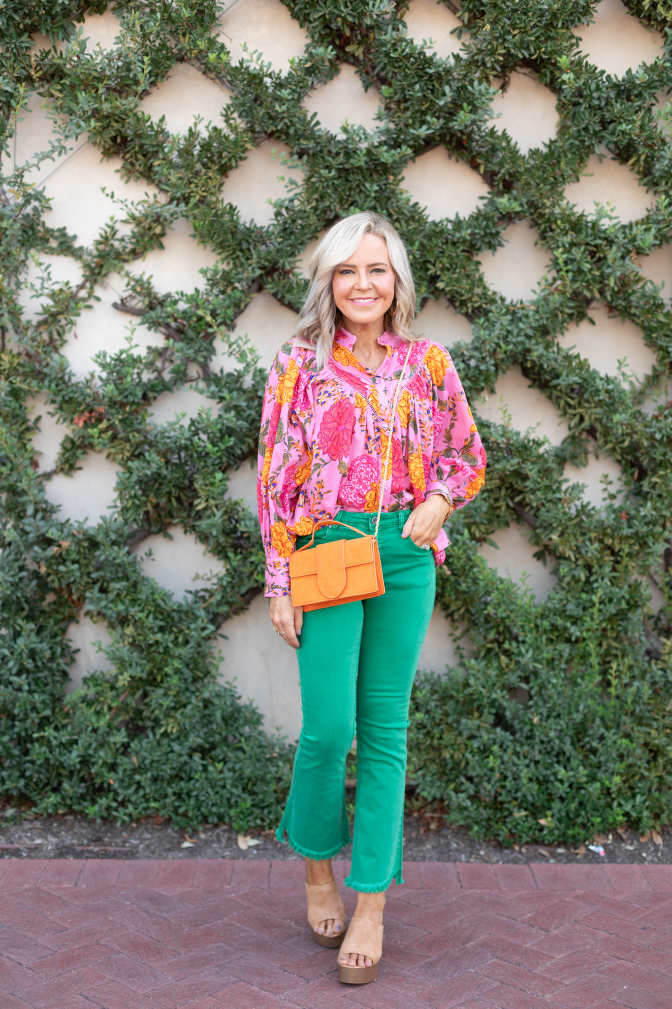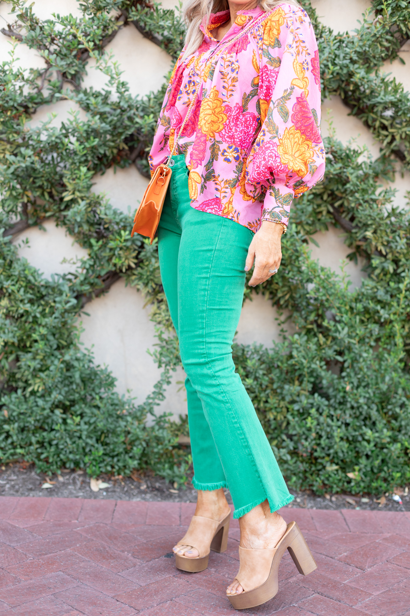Hands down my favorite shirt for this seasonal debut is this exaggerated floral find… it totally gives me Farm Rio vibes for a fraction of the price and its beautiful feminine detailing is just icing on the cake of one top-notch top. Blouson sleeves with tiny crochet detail and pinch pleating on the front = a sleek style everyone will adore for autumn. [available in sizes small – large $75]