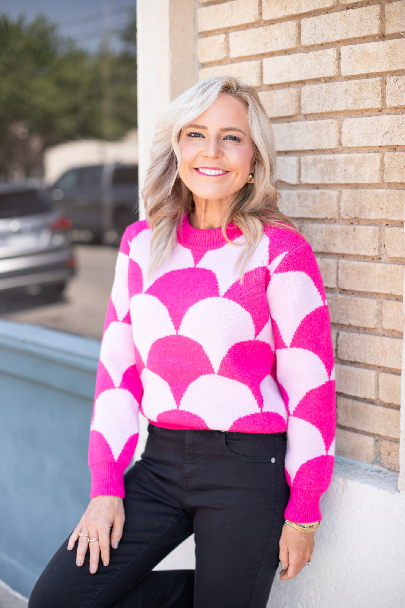 When you love a sweater so much you debut it in not one but TWO colorways… a total knack for knits with this stunning knit beauty in bold orange and bright pink with a statement scallop design everyone will love! The perfect relaxed fit for fall with a staple crewneck design and boxy cropped fit = the perfect companion for cooler days! [available in sizes small – large $54]