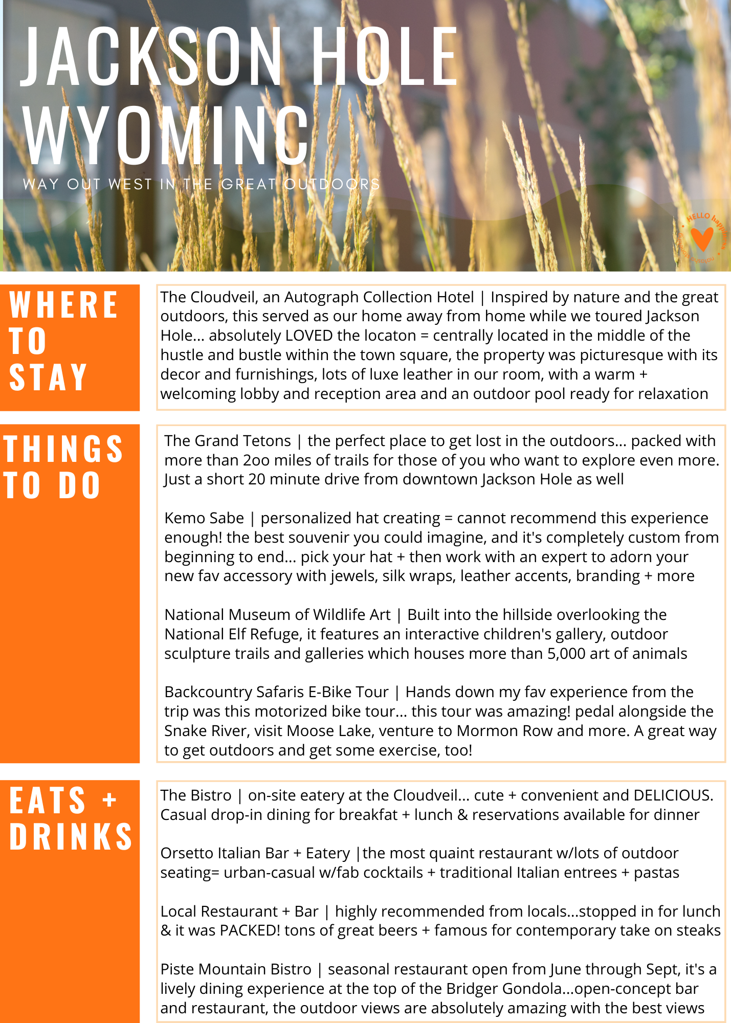 Ready for the full rundown in one easy to read and save travel guide?? Look no farther than the one-sheet wonder with everything we chatted in detail about above for Jackson Hole, Wyoming: