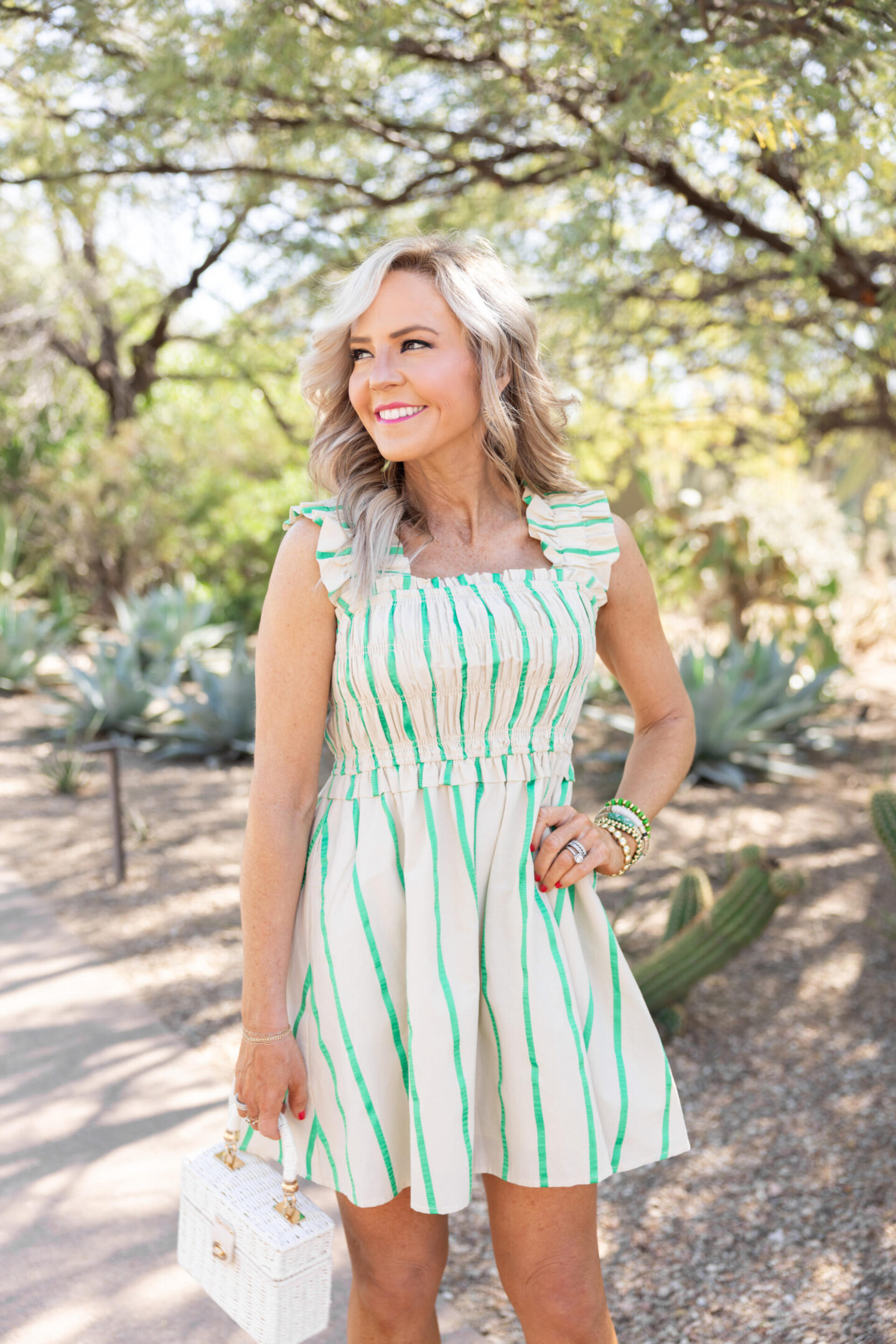 Green with envy… this adorable fit and flare is a spring celebration all in one mini silhouette. I love the ivory background with that pop of spring green. The smocked wide-strap detail ensures a comfy but fab fit all day =it’s time to spring it on! With its empire bodice and high waisted styling, it’s a figure flattering choice for all. [wearing XS/runs TTS]