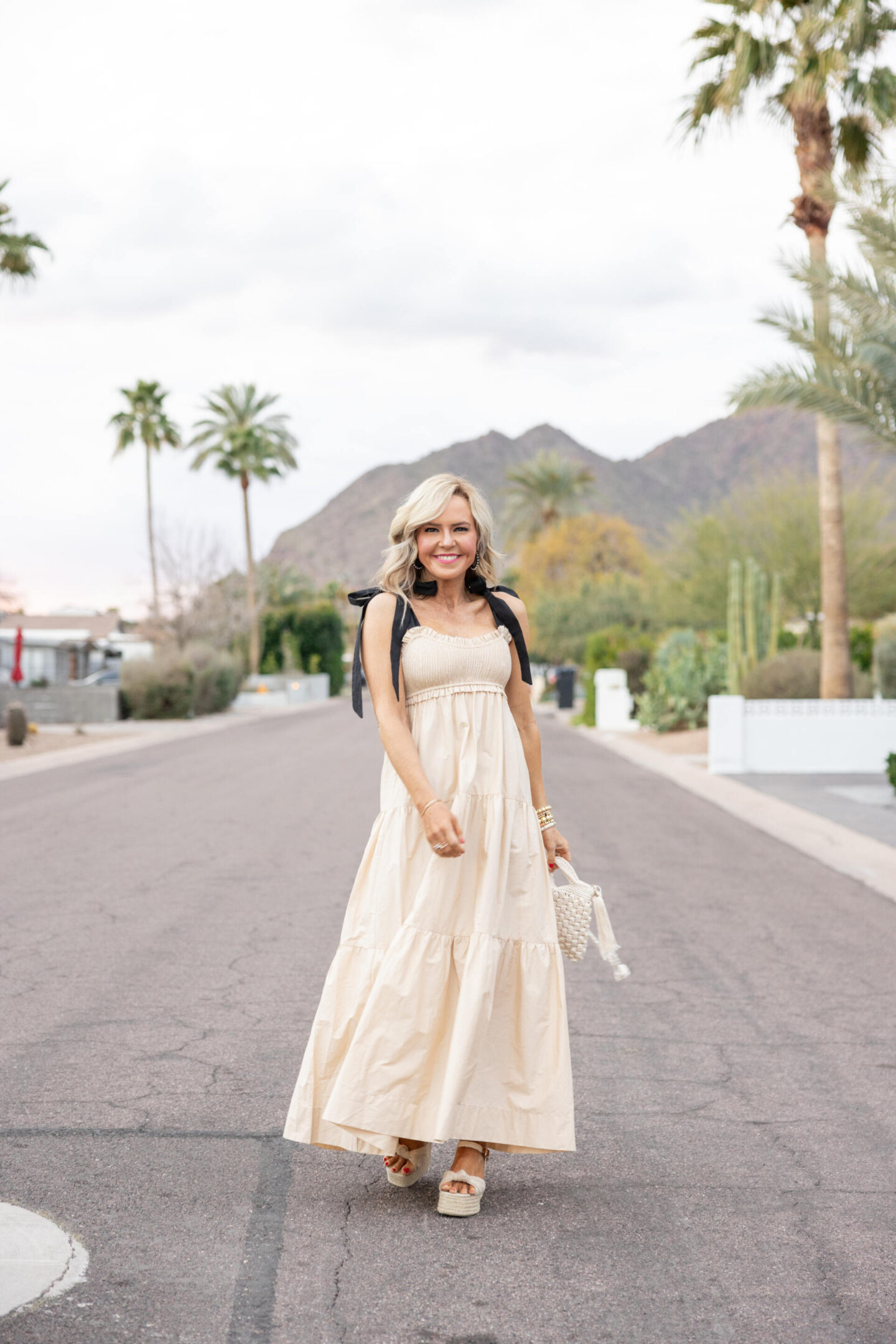 Notice a look-a-like moment happening here??? Oh yes indeed. It’s inspired by a maxi I wore all last summer, but this one is 1/2 the price = cue the confetti! Yes you neutral lovers are going to go GAGA for this gorgeous tiered style… the off white bodice accented with black bow details = it’s a statement all on its own! Layer it up now with the Roxanna Denim Jacket and you’re good to go for spring [wearing XS/runs TTS]