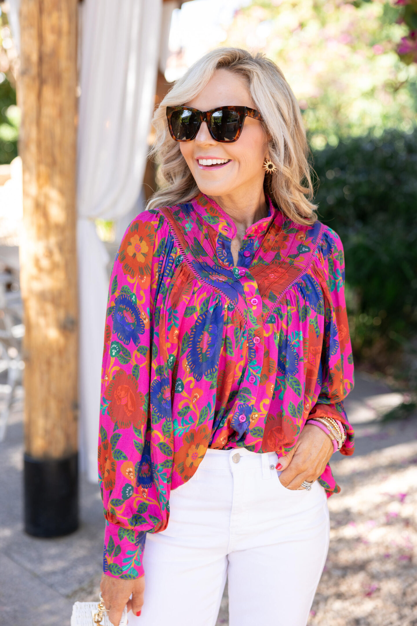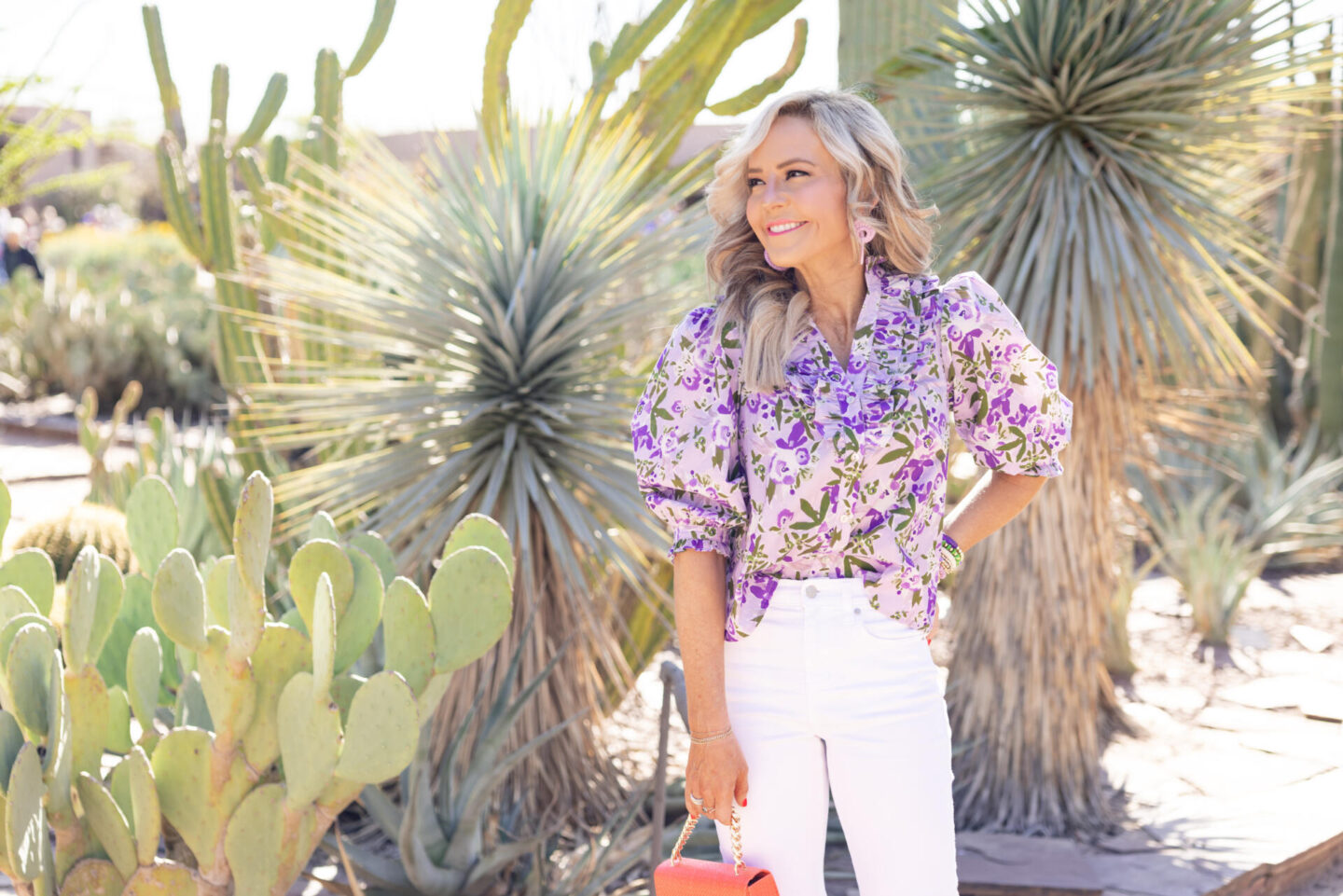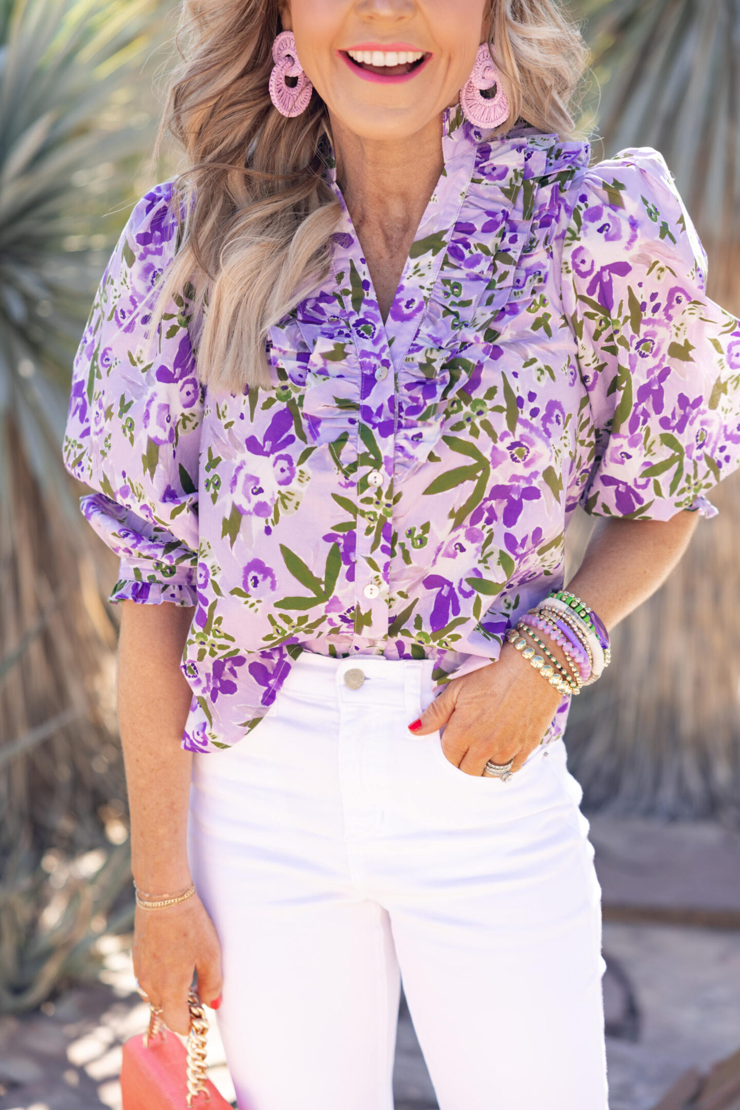 Step right up for something lovely + lavender… this fabulous floral top is what you’re going to want to wear all season with its vibrant colorway in the most gorgeous blooms on a blouse. Feminine and fun, I just adore the ruffled up front bodice and 3/4 length sleeve detailing. A must-shop warm weather staple and this seals the deal = spring has officially sprung! [runs TTS/wearing XS]
