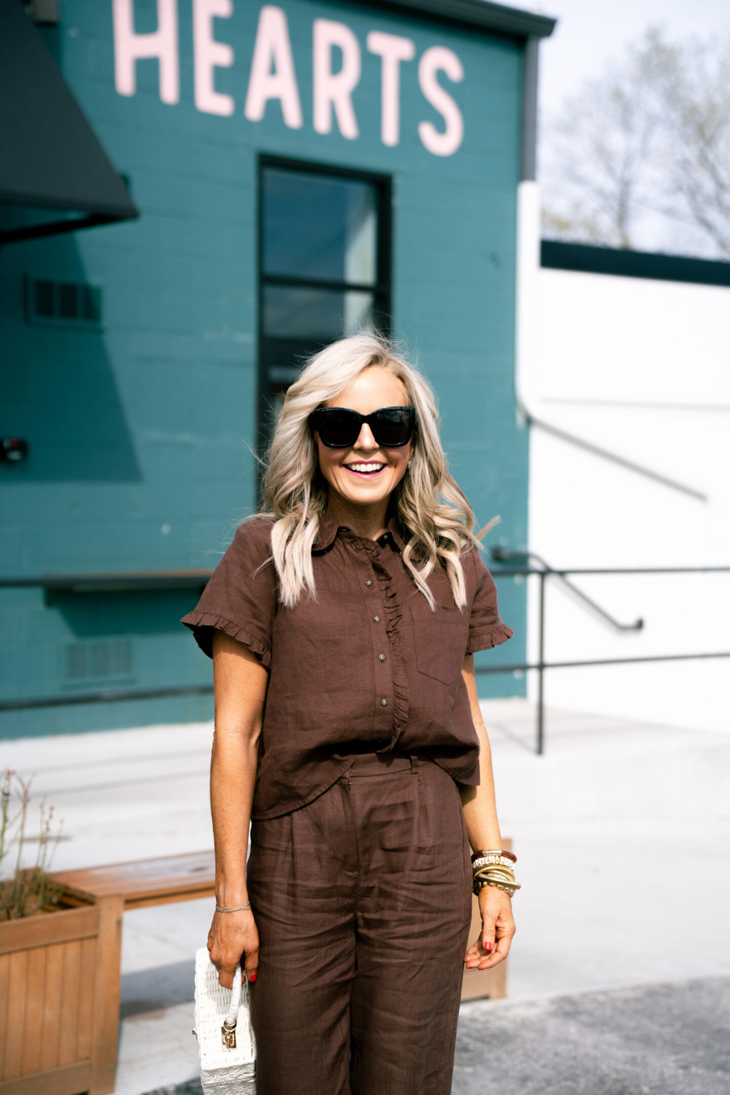 Starting things off on top, let’s discuss this Ruffle-Trim Button Up Shirt [shown in color Roasted Cocoa/wearing size XXS]. It’s super soft fabricated in 100% linen and you already know I fell in love with this because of the short sleeve silhouette doubled with the slight ruffle detail at the collar cuff and down the front for good measure. Super soft to the touch + available in 4 colors, it’s a lightweight piece made for taking on the town!