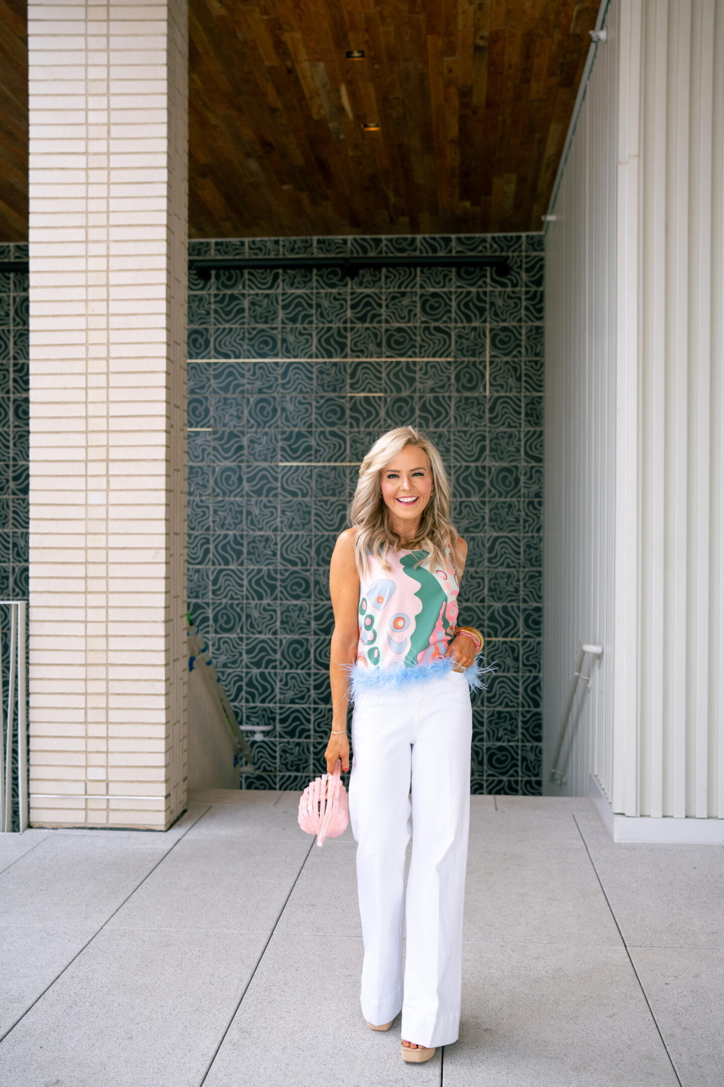 This Faux Feather Sleeveless Top gives us all the sherbet colored vibes with its all over paisley pucci-esque print and of course feathers to make it all the more sensational + special. It has every pastel hue you could imagine and of course I paired it with my favorite Wide Leg Denim in White. Elongating the gams, they are a staple for spring + summer and can totally be transformed from lunchtime casual to date night divine in a jiffy! Of course I had to add in some of my favorite stacked espadrilles + an acrylic clutch to complete the ensemble, too.