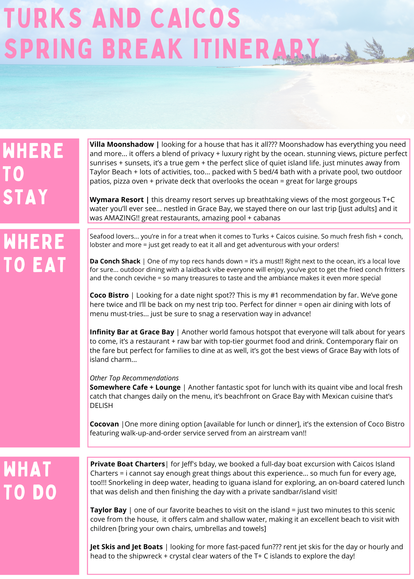 ++On the other hand, When Jeff and I went to Turks back in 2018, we stayed at the Wymara Resort… a completely different, more modern + luxe setup and great for adults = absolutely loved both for different reasons with lots of restaurants on site and fun night-life, but wanted to add this as another option for consideration, too!