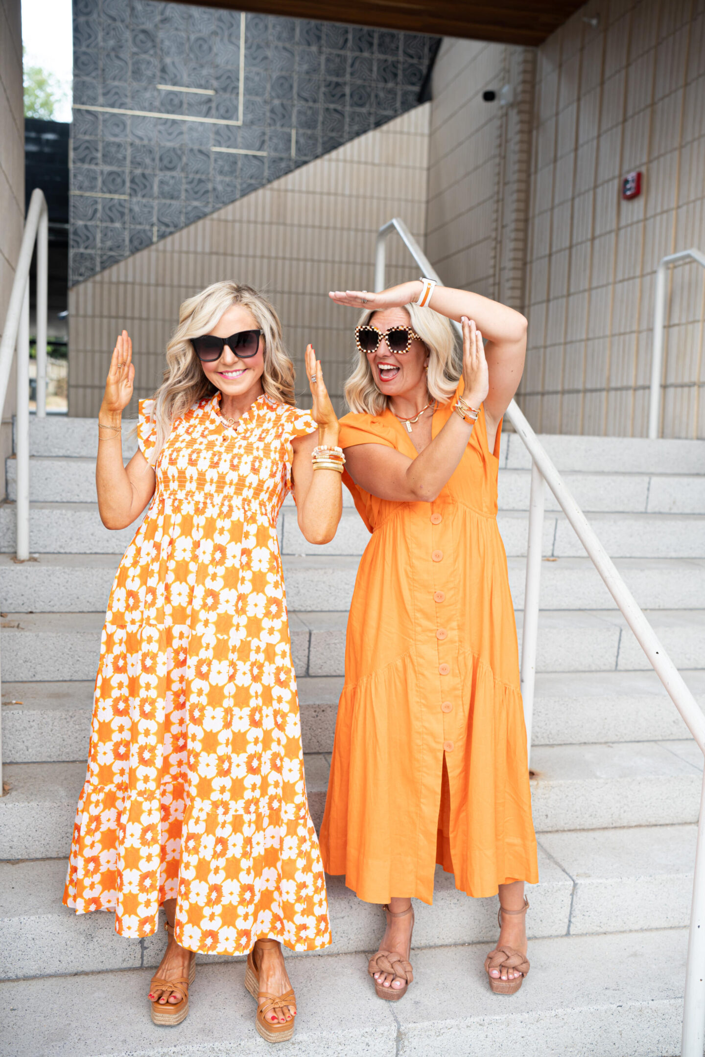 Step up your gameday style with this Orange and White Smocked Midi Flutter Dress [runs TTS/wearing XS] from my friends at Briton Court! Perfect for supporting those Tennessee Vols I love so much… this dress blends comfort and flair with its playful ruffles and easy breezy silhouette. Pair it with tan wedges, a chic crossbody bag, and a bestie inher coordinating Orange Linen Button Front Midi Dress and call it complete – you’ll be effortlessly stylish, chic + cool while cheering on your team!! P.S. check out the full Briton Court gameday lineup here.
