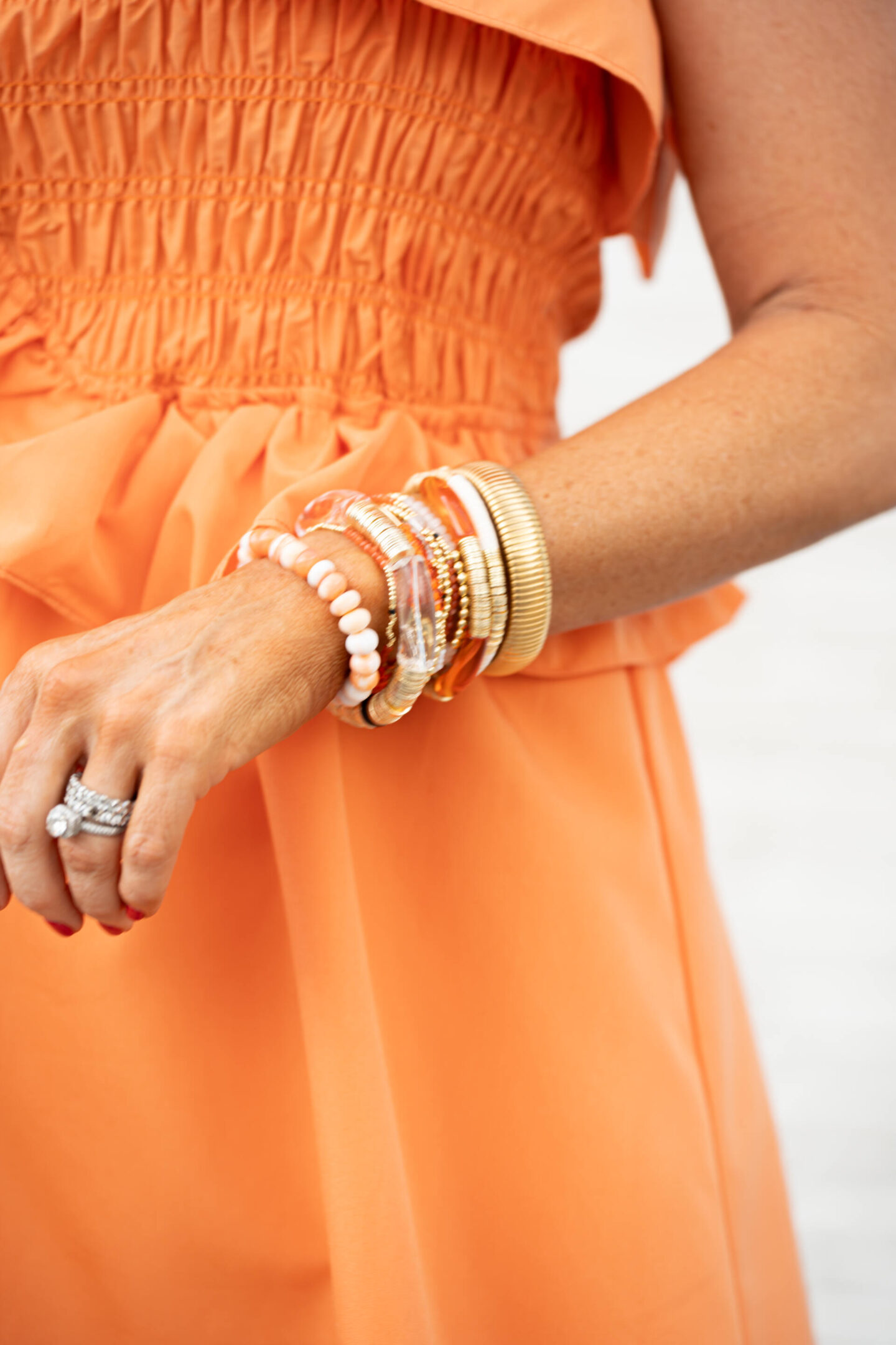 Moving onto some mini-making magic… it’s time to turn heads in this fabulous one-shoulder orange mini dress that just launched at Shop Avara, perfect for gameday excitement [wearing size small/runs TTS/under $70 with code NATASHA15]! The ruffled detailing and smocked bodice create a flattering + fun look that’s sure to make you stand out in the crowd. Complete the outfit with a cute [clear, if you must] handbag and this all new Orange Gameday Stack from Allie + Bess for a full spirited ensemble [use NATASHA20 for 20% off my arm candy, too].