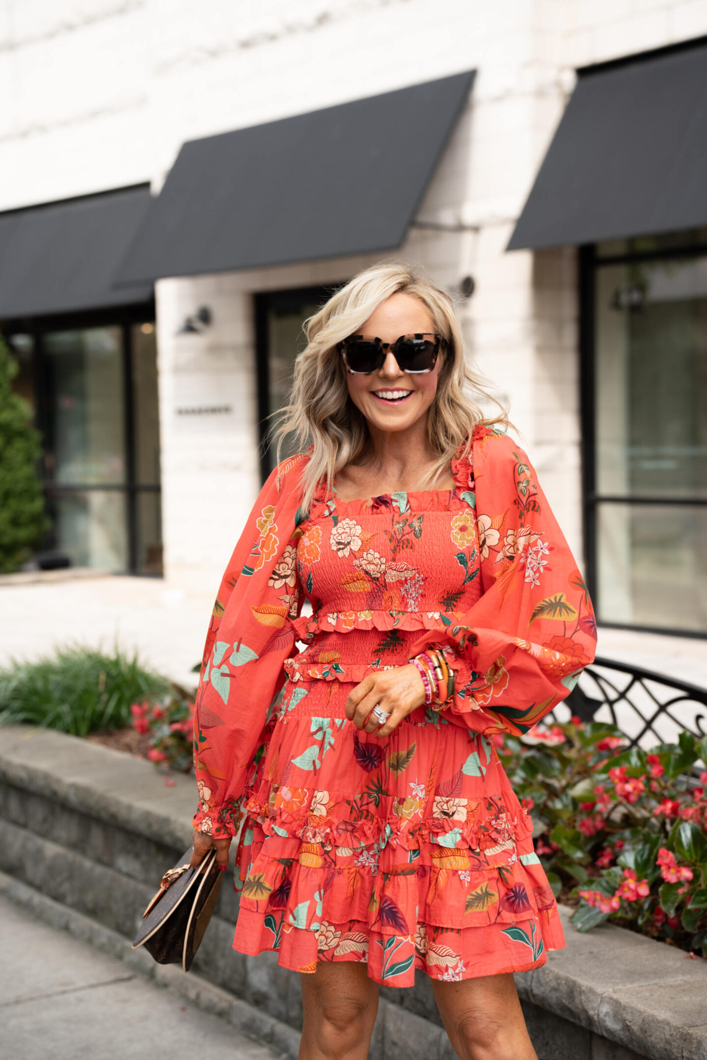 Now, let’s think a bit more autumn with longer length sleeve details to devour… step out in style with this peachy pink number from Farm Rio’s fall collection with Anthropologie! The rich hue adorned with a lively floral print makes this Smocked Ruffle Mini Dress [runs TTS, wearing XXS] an absolute standout = even better, it’s on sale for under $100 right now, too. The long puff sleeves add a touch of elegance, while the ruffled tiers bring all the fun and movement. Pair it with your favorite wedges and a chic handbag, and you’re ready to turn heads wherever you go…