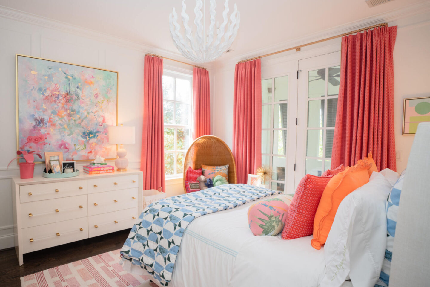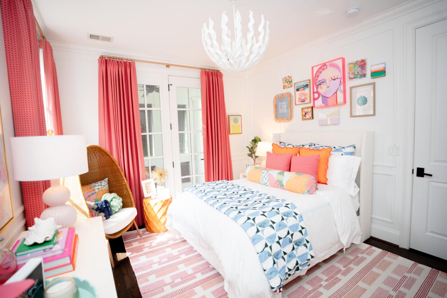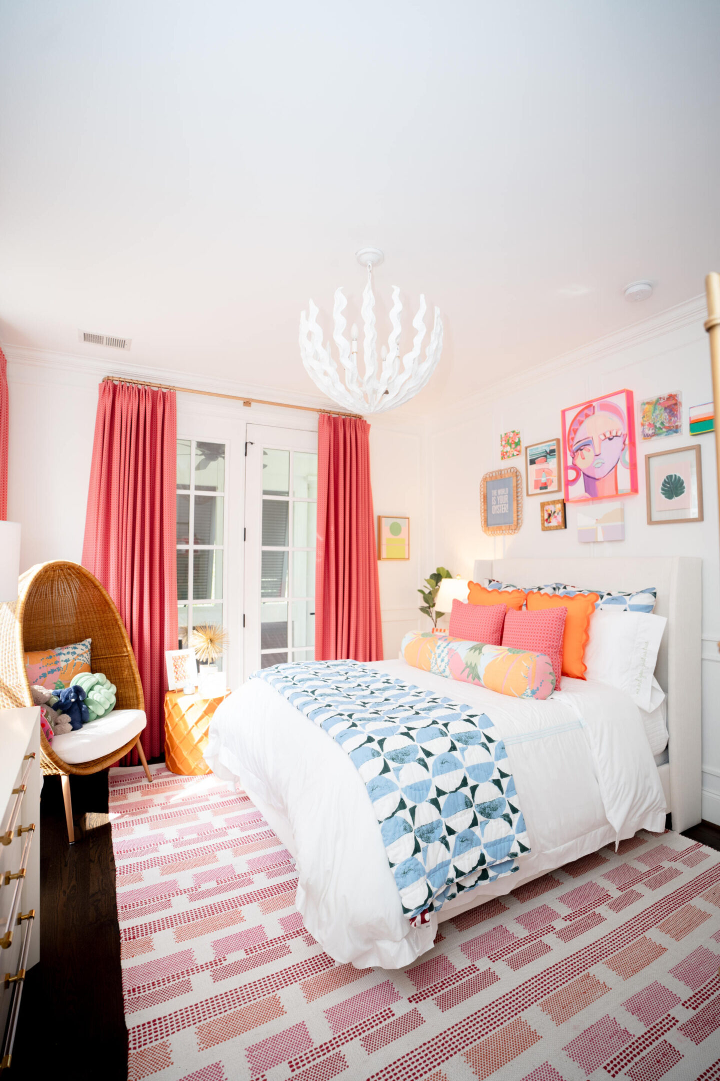 This lively space is designed to grow with her… from her current tween obsessions into a space that is still sophisticated and feminine once she is a bit older as well. Our bold, independent girl deserved a room equally as dynamic as she is, and this redesign delivers just that. The soft pink and orange accents balance perfectly with the room’s chic aesthetic, while the playful pops of color in the cushions and art add that extra dash of whimsy. With thoughtful touches like the geometric quilt and a dash of gold accents, this space truly encapsulates the essence of a bright + beautiful tween bedroom chosen to reflect Carson’s personality and unique style, full of life and light ;).