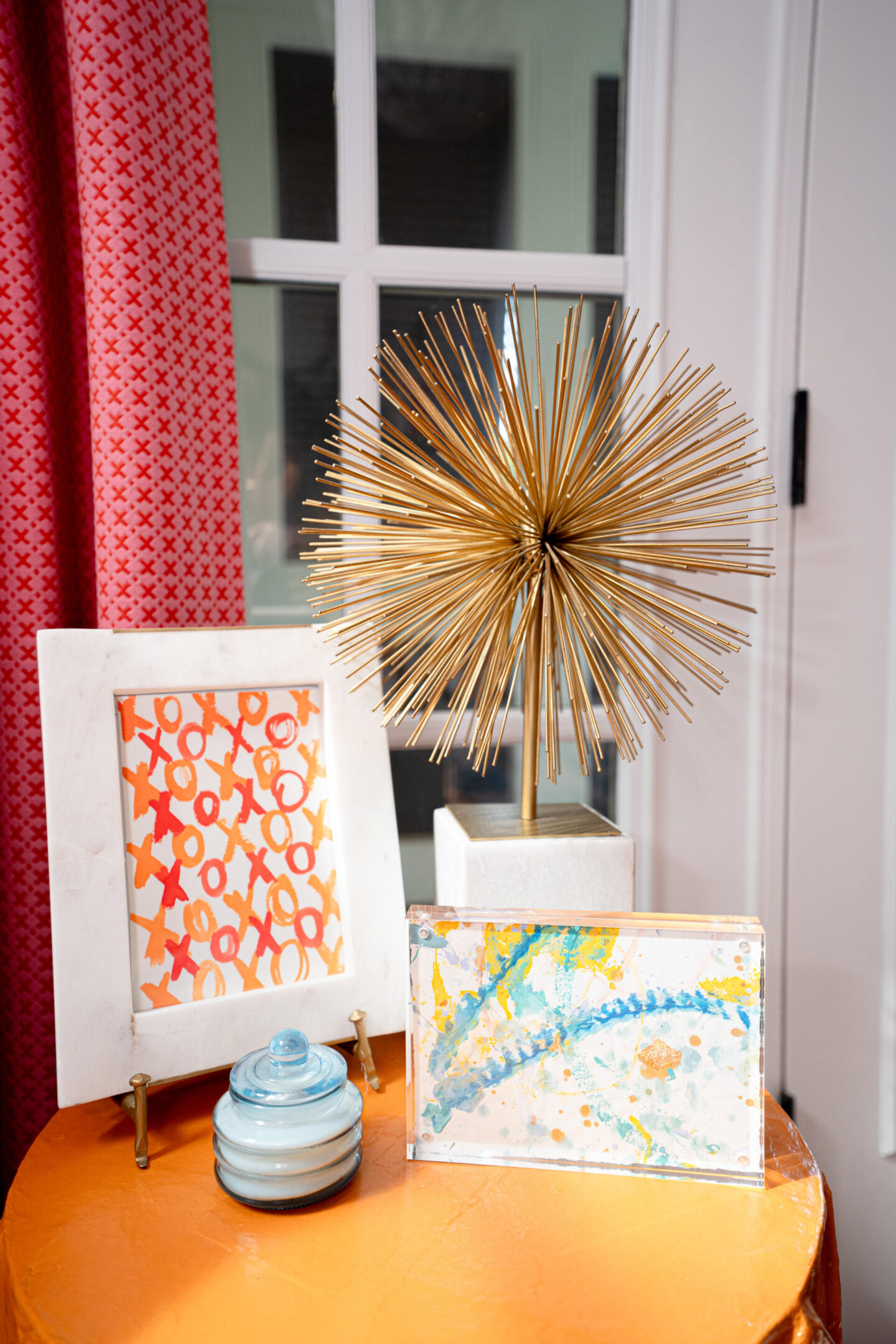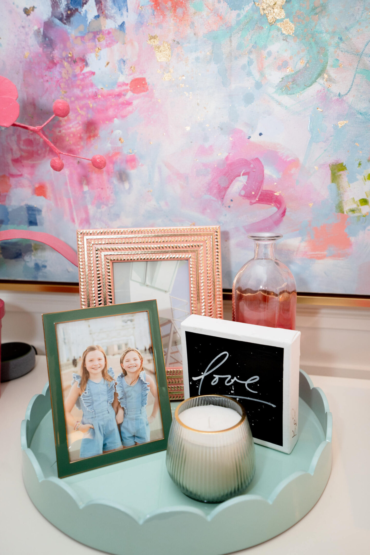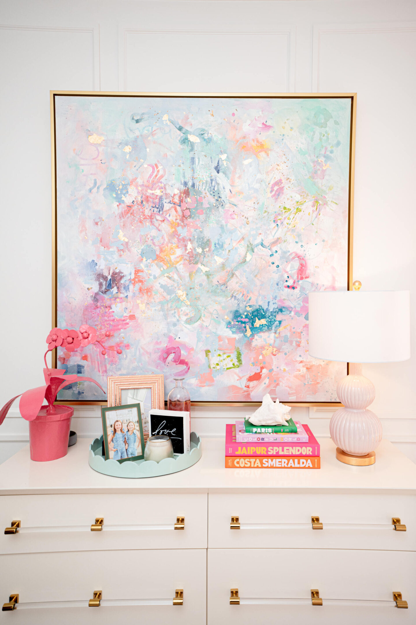 Let’s face it… good design is fabulous, but it’s the accessories and extra well-thought-out details that truly transform a space to call it complete. Case in point, the showstopper abstract piece above Carson’s dresser is something she and my super talented friend Kelly Terrell created together. Something truly unique and a piece of art she can take with her into her own home someday! It’s like a pastel dream come to life with swirls of color and shimmering gold accents that elevate = seriously one of a kind. We also wanted to bring out some additional pops of bold hues with the accessories on her dresser… colorful travel books to inspire her next adventure and of course a cute framed pic of her and her sissy. And of course no room in our home is complete without a decorative object like this faux potted orchid from Stray Dog Designs.