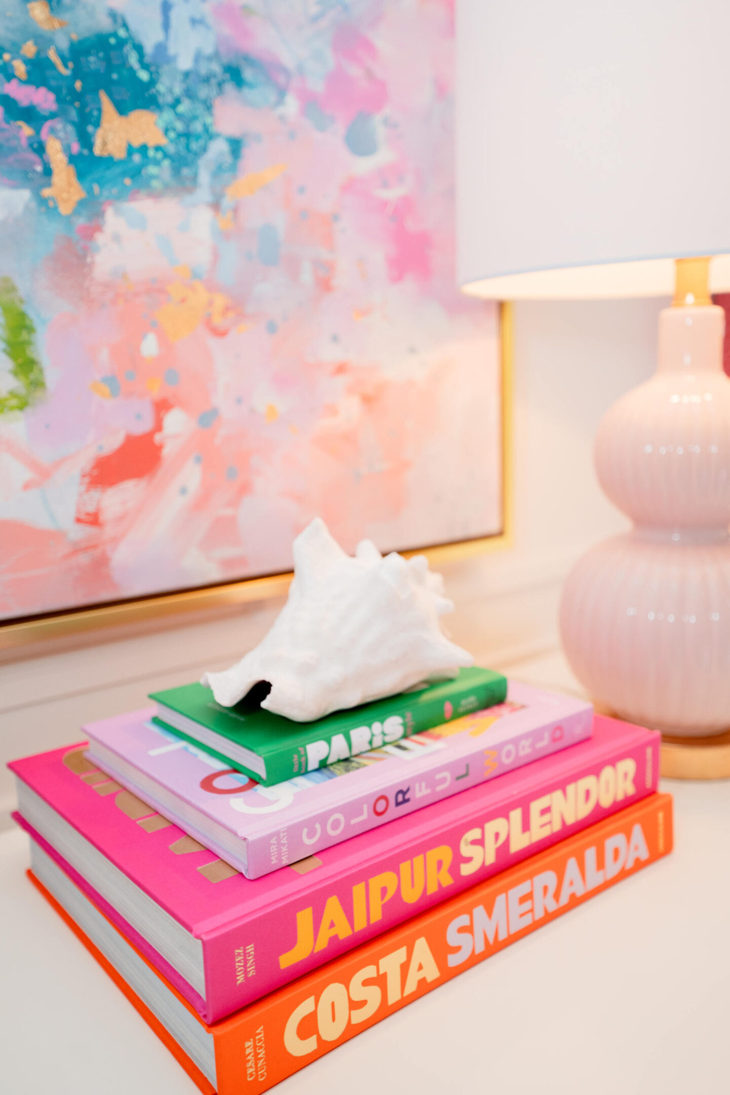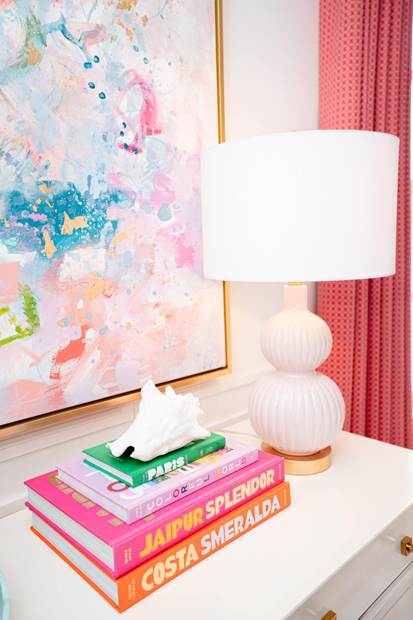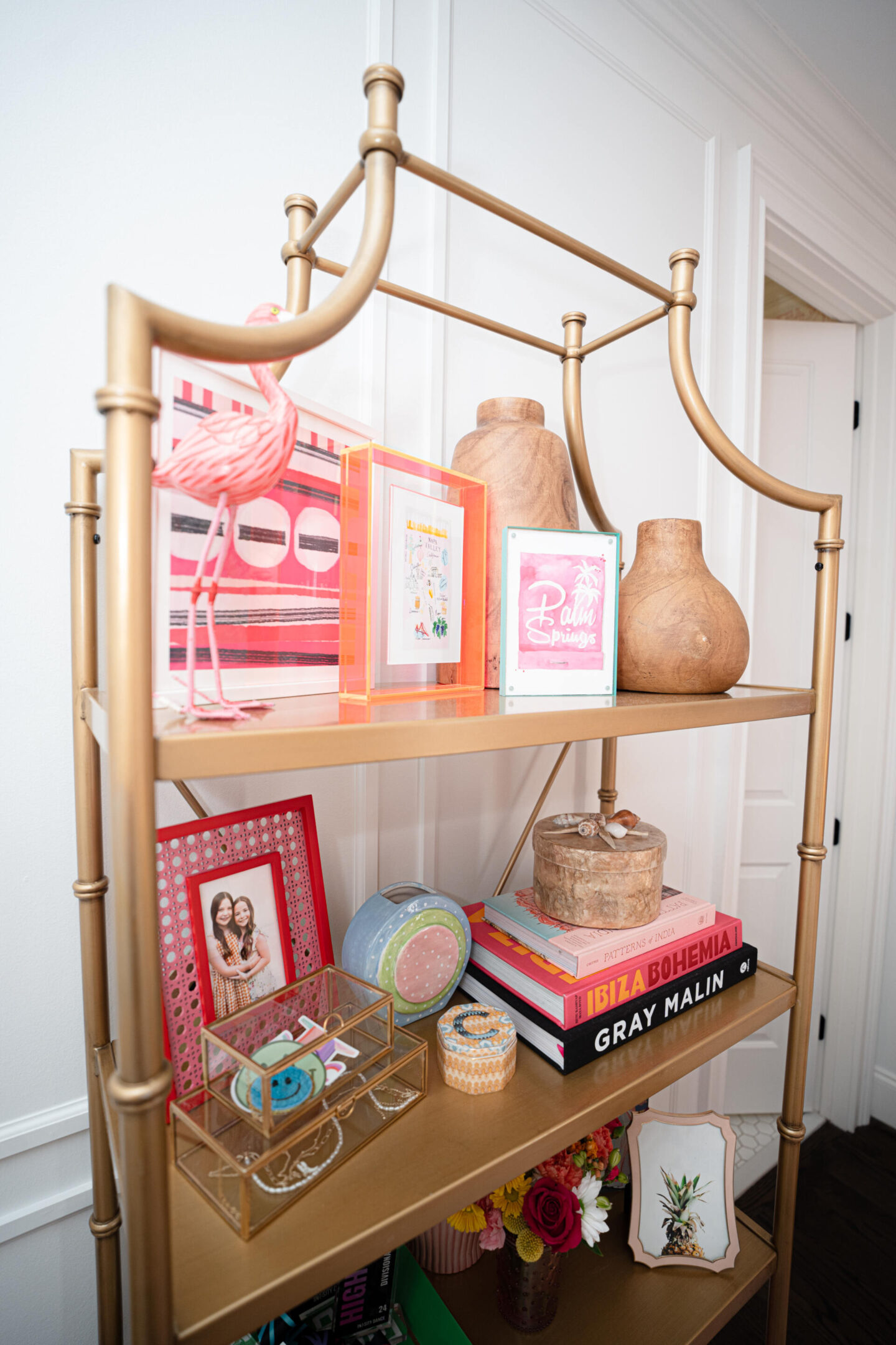 Let’s face it… good design is fabulous, but it’s the accessories and extra well-thought-out details that truly transform a space to call it complete. Case in point, the showstopper abstract piece above Carson’s dresser is something she and my super talented friend Kelly Terrell created together. Something truly unique and a piece of art she can take with her into her own home someday! It’s like a pastel dream come to life with swirls of color and shimmering gold accents that elevate = seriously one of a kind. We also wanted to bring out some additional pops of bold hues with the accessories on her dresser… colorful travel books to inspire her next adventure and of course a cute framed pic of her and her sissy. And of course no room in our home is complete without a decorative object like this faux potted orchid from Stray Dog Designs.