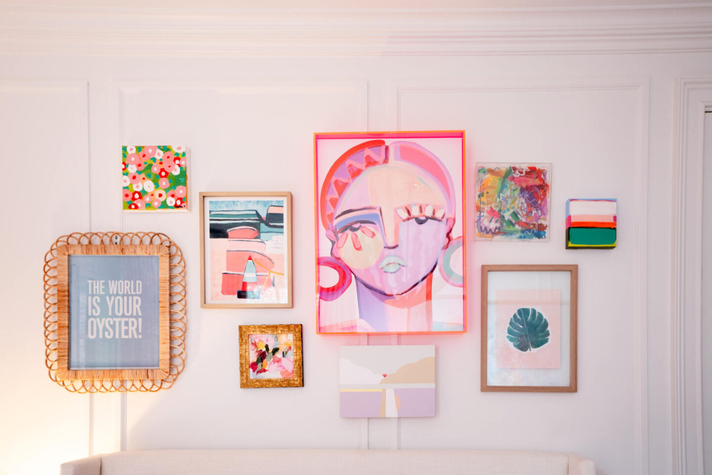 All Things Art | The World is Your Oyster Print [similar here], Palm Leaf Print [similar here], Kristin Shearer Shape Original Framed Art, Brittany Atkinson Framed Acrylic Shadowbox, Brooke Lancaster Original Art, Hannah Dean Original Art