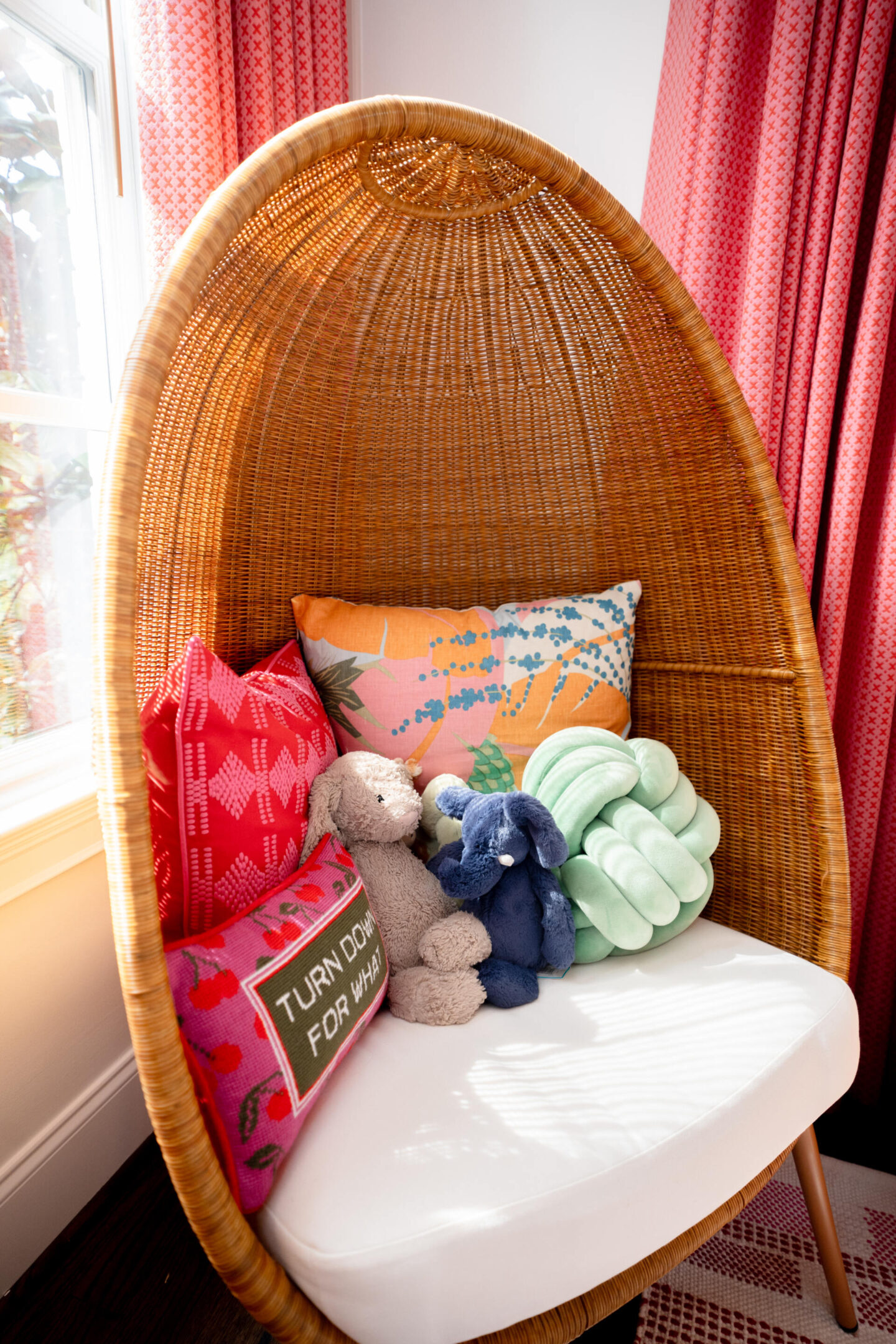 Oh, and that Pottery Barn Teen woven egg chair? Total hangout goals! The cozy wicker vibe, needlepoint pillow from Furbish Studio, Schumacher Ananas Print Pillow, Mint Green Knotted Pillow and Annie Selke Red and Pink Cushion make it the perfect spot to curl up and chill.