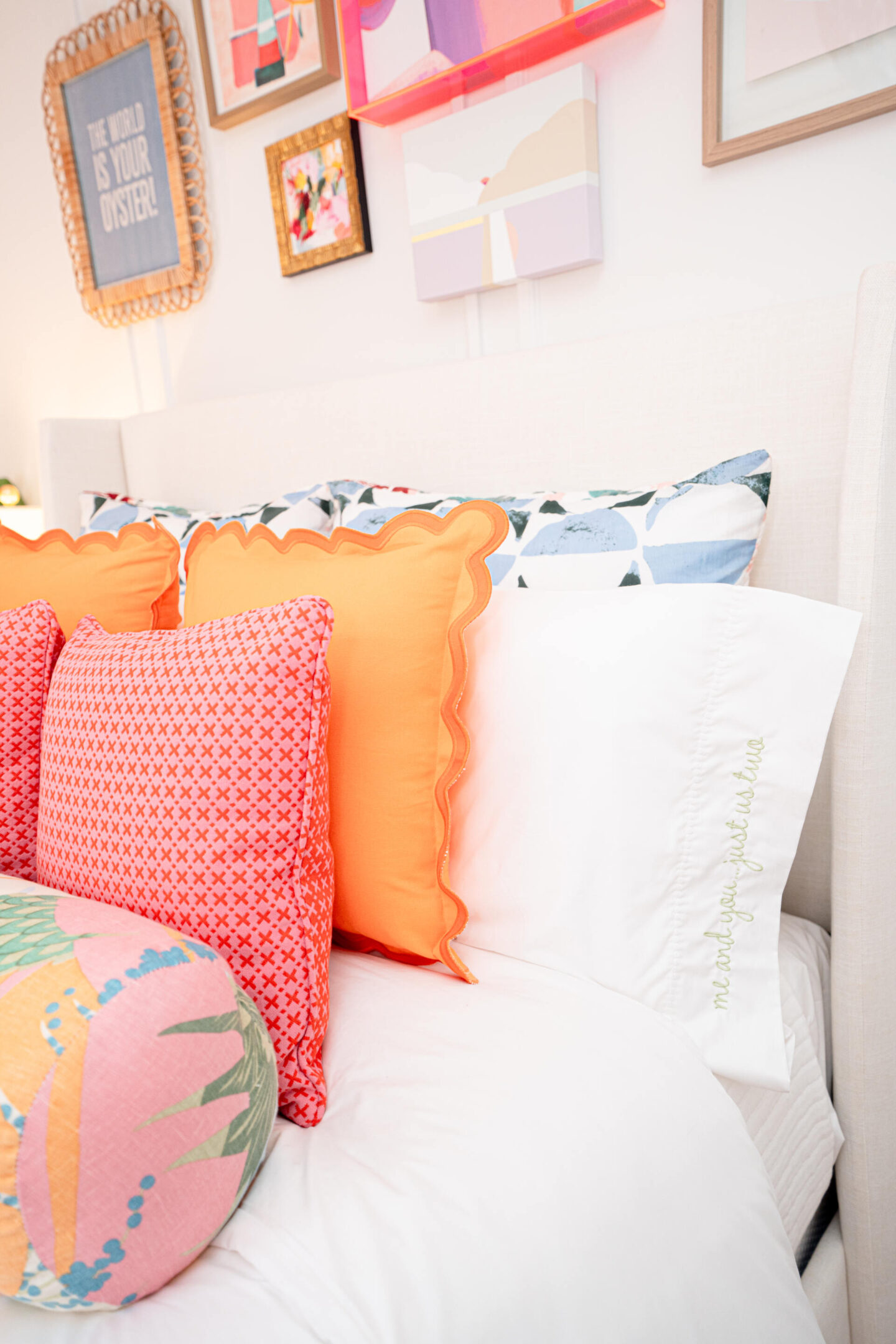 Of course no bed is complete without properly layering up the pillows so that’s where I incorporated a bold Anthropologie quilt + coordinating euro shams, orange scallop square varieties from Folkulture and then coordinating Elias Print Pillows to match her drapery. Another accent pillow was incorporating the Tropical Ananas print from Schumacher, this time in an oversized bolster version. It’s like the bed is begging for a sleepover or a lazy weekend morning [a mom can dream]... my personal favorite touch is the embroidered pillow case that says ‘me and you.. just us two’ by a local shop, Sew What Gifts. I first did a similar style on Caroline’s pillows and so I wanted to continue this sentimental tradition with nugget = this is what I tell her every night when I tuck her in, so a nod to our relationship, too.