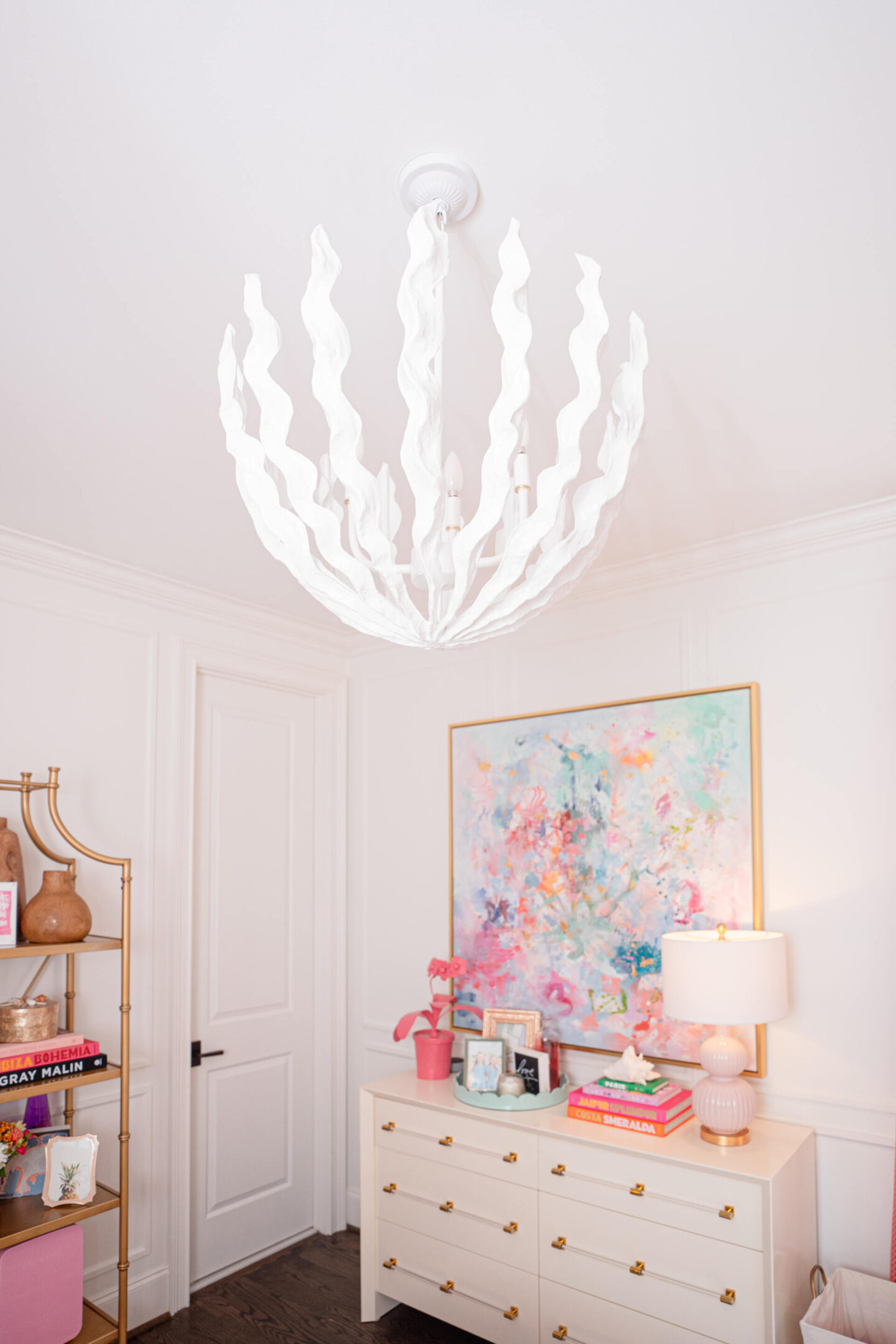 Be sure to take note of the iconic Chucho Chandelier on the ceiling. Another fabulous light from my local Tennessee friends at Stray Dog Designs = we went with white so it would blend with the walls + ceiling, but LOVED the shape and dimension it brings to her boudoir!