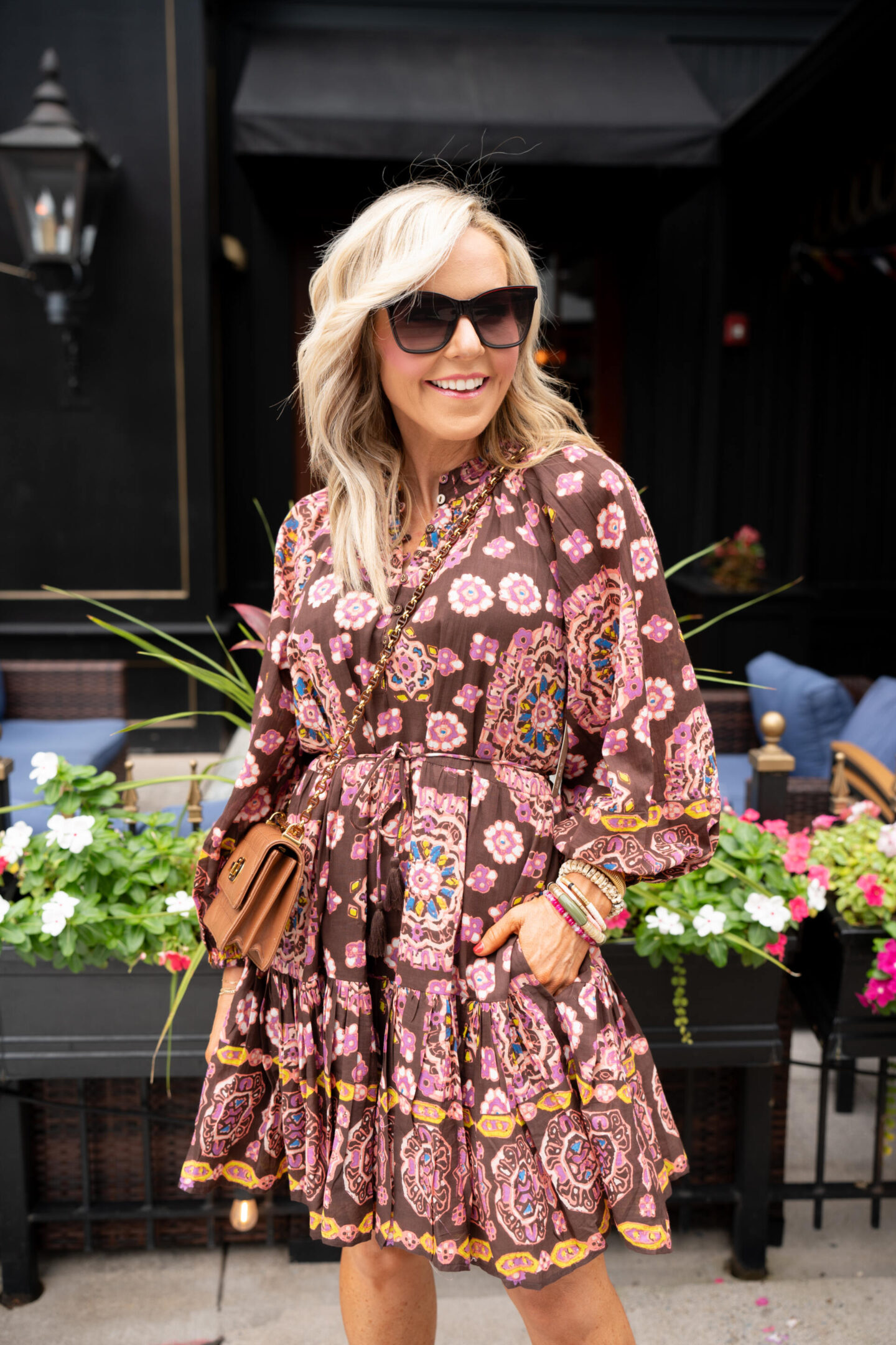 Beginning with this Cleobella Eliva Mini Dress [runs TTS/wearing XS] that’s giving all the fall-ready vibes, this rich brown backdrop combines an intricate pink and gold floral pattern to pop off the page! The flowy, relaxed tiered silhouette and billowy sleeves bring an effortless comfort, making it the ideal piece to transition into cooler days while keeping that playful, free-spirited energy. Style it with knee high boots and some arm candy to complete your autumn look! The best part is that you can cinch it with the self tie belt OR leave it off for a more flowy type of silhouette.
