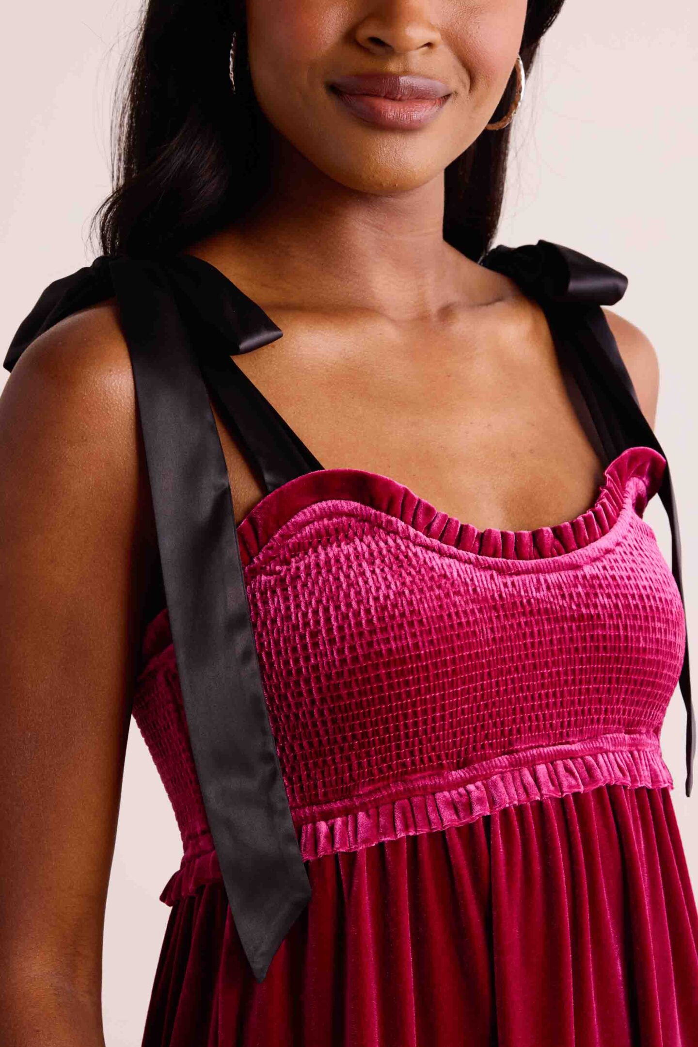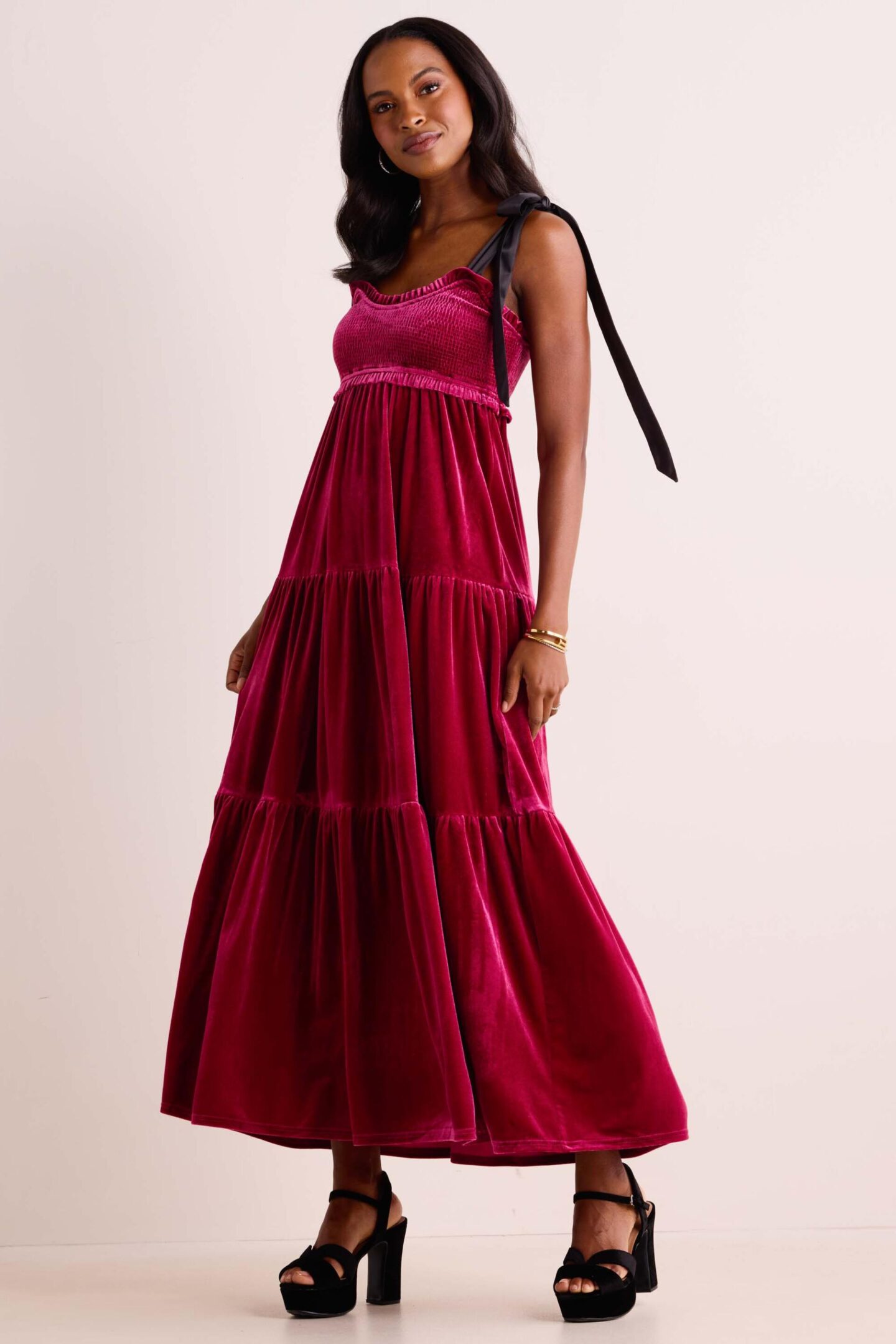 You know I can never get enough maxi moments… even during the holidays! This gorgeous dark pink velvet moment accented with bow straps is everything you want to wear for Christmas, while still keeping your personal style intact. It’s fresh and fun and offers a million ways to wear… layer it up everyday with the Roxanna Denim Jacket or put on the perfect Joan Jacket for a chic velvet on velvet number. Any way you wear it, you’ll be the belle of the ball! [wearing size small/runs TTS]