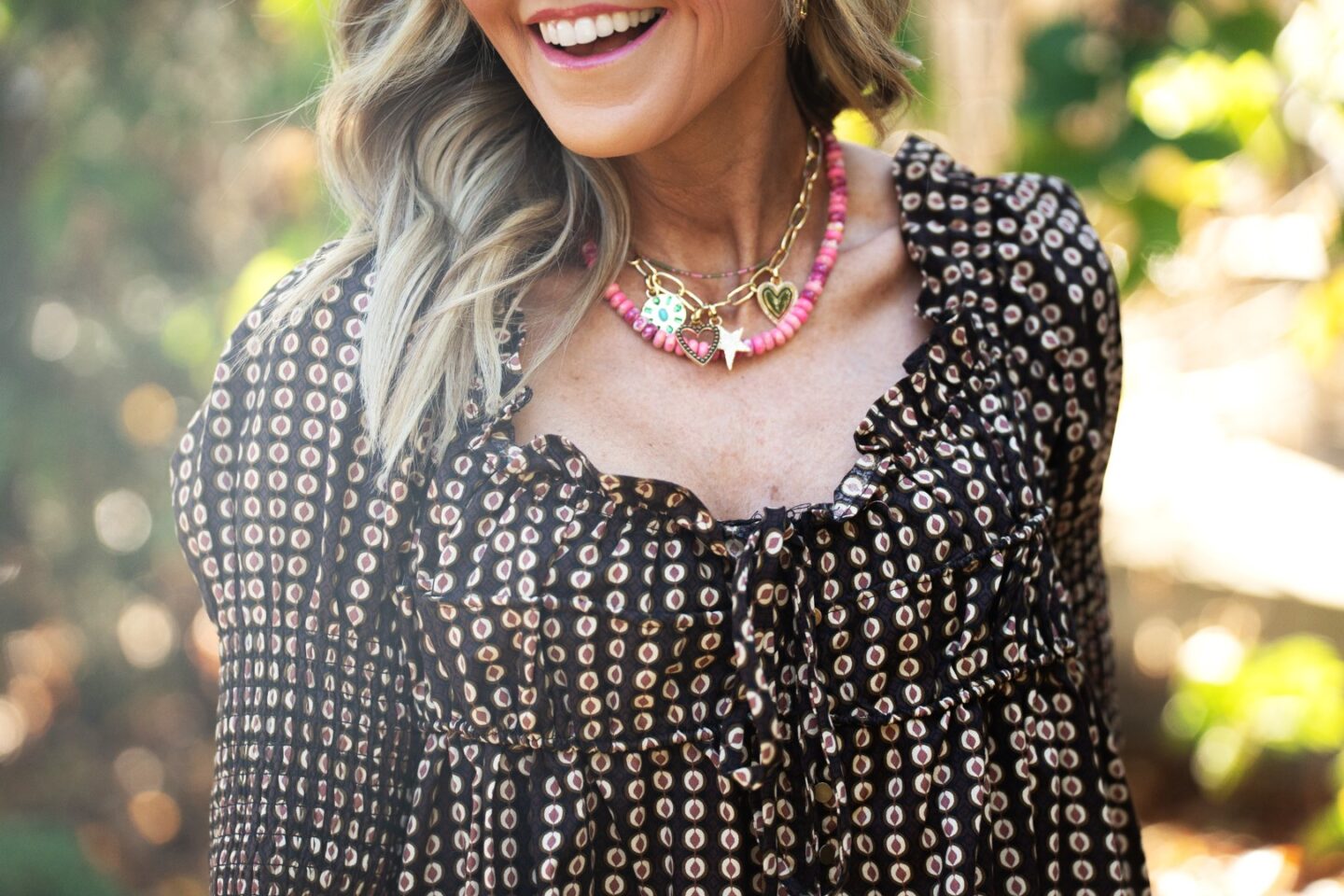 Ready for more winter wonder + magic??? You’ll be set for holiday success with this statement stack of GORGEOUS necklaces for one big VOILA moment!! Next in line is the My Only Wish Necklace Trio… we took our all new charm necklace and then added in a happy holiday Nori Pink + Green Seed Necklace for a bit of dainty as well as marbled beads by way of the Chloe Necklace and you’ve got a three piece stack made for making your wishes come true!
