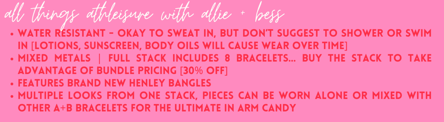 When it comes to those outfit pairings, this bracelet stack is a total chameleon! Afterall, athleisure isn’t just a clothing movement, it’s a lifestyle… dress up your favorite active set—think a matching hoodie and joggers paired with sleek sneakers—for a sporty yet put-together vibe, or keep it casual with a cozy pullover and leggings for errands around town. Feeling a bit bold? Pair it with a structured blazer, distressed denim, and sleek loafers for a stylish blend of modern + classic. This stack truly transforms any outfit into a polished ensemble with minimal effort!!