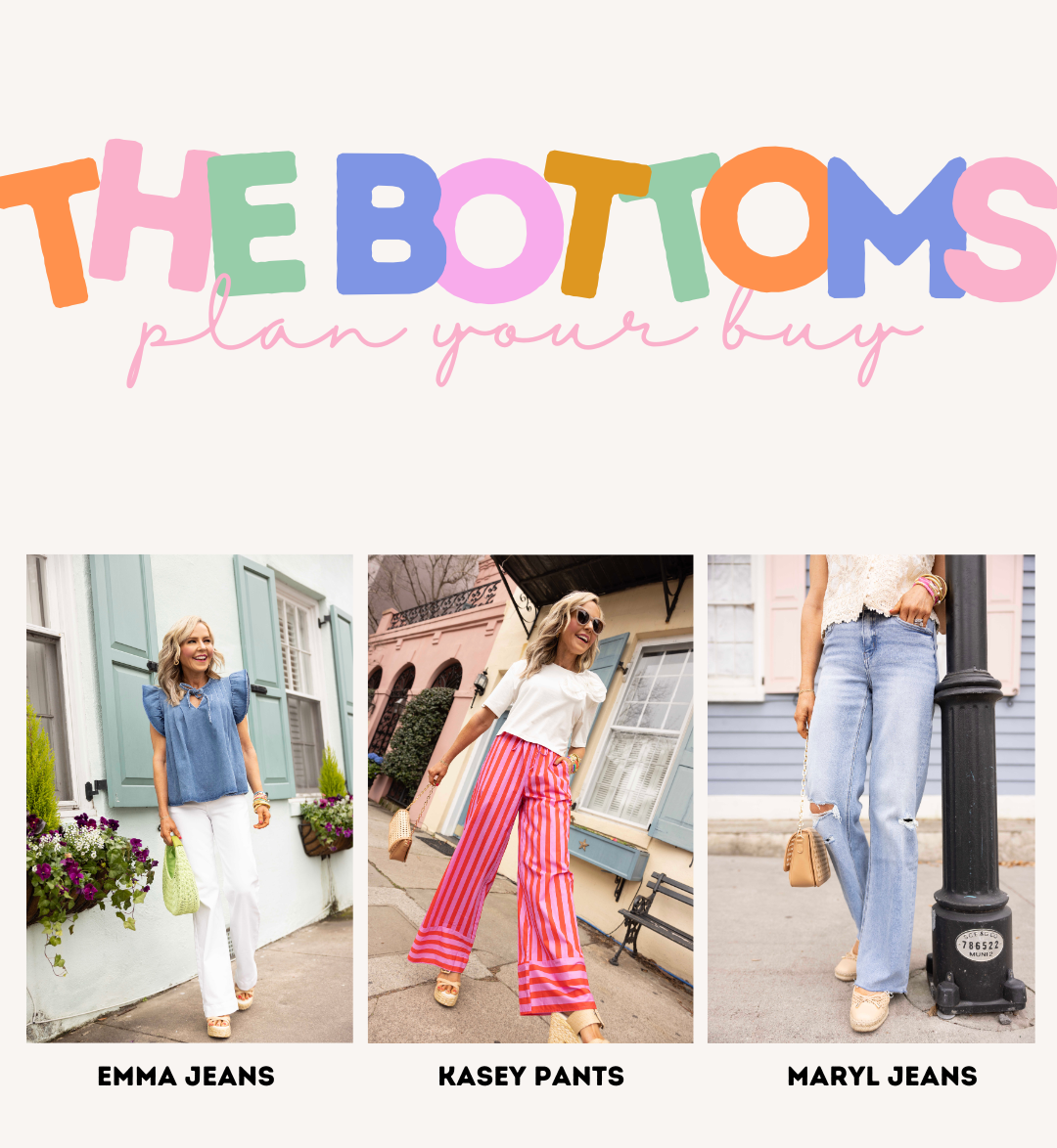 Moving onto the bottoms = a few classic styles of jeans but with a modern moment to keep them totally on-trend and of course the printed wide leg style you’ve all been asking me about every time I post a little sneak peek… three styles of all new essentials to style over and over again this spring!