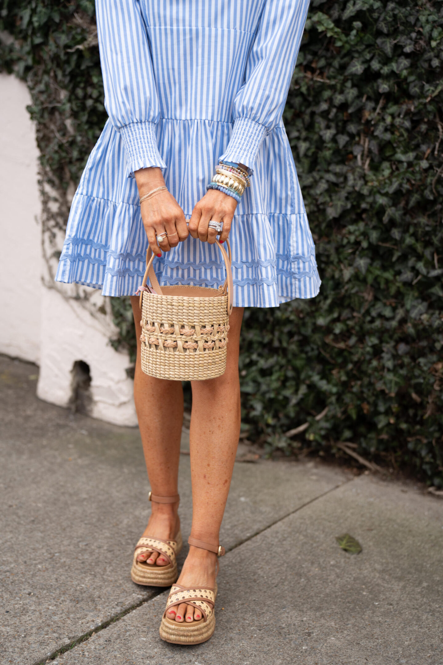 Lightweight and easy to wear for everyday AND for all those fun springtime days coming soon, it’s the perfect throw-on-and-go piece for whatever warm weather comes our way! Whether you pair it with Cane Woven Sandals and a woven Bowan Bucket Bag like I did for a casual daytime look OR dress it up with espadrille wedges and gold jewelry, this is one of those wardrobe staples you’ll reach for again and again!