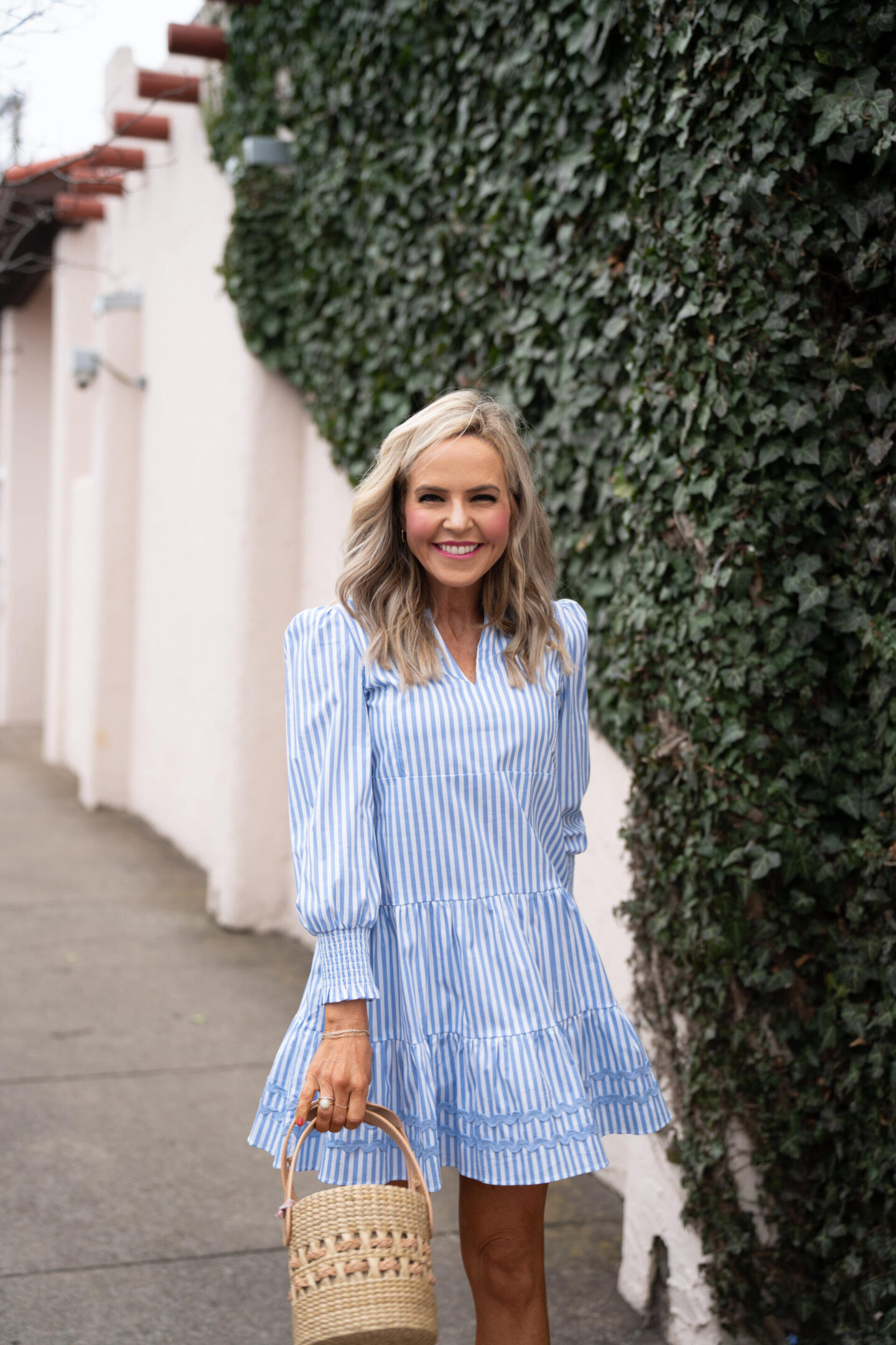 If you’re like me, you’ve got all things DRESSES on the brain… so many fun springtime events and occasions coming up where the perfect little dress fits the bill, like this absolutely adorable Striped Tunic Flare Dress [wearing XS/runs TTS] from Sail to Sable. This breezy + oh so effortless beauty blends french blue with white for a classic combo gives it that coastal chic vibe, all while the tiered skirt and smocked cuffs add just the right amount of feminine flair.