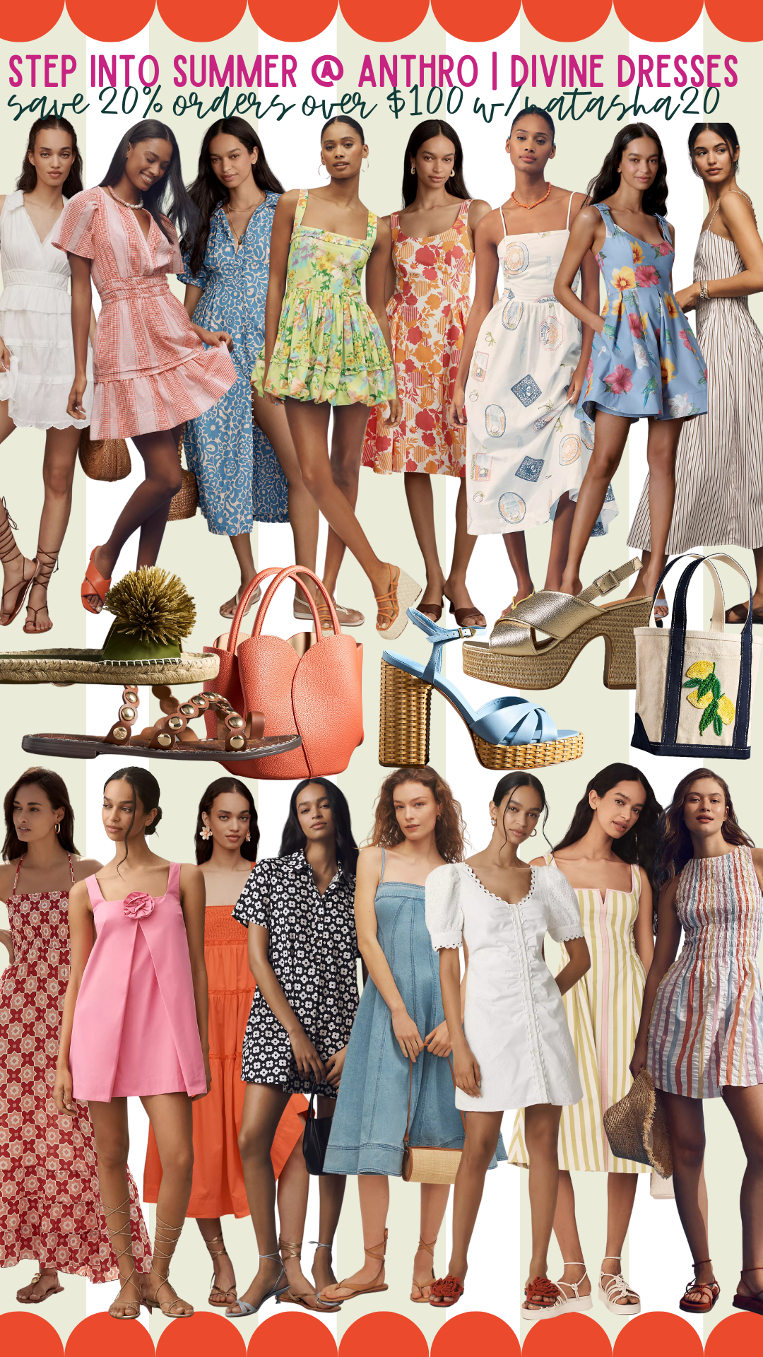 Nothing says summer like an Anthro dress lineup this good! From coastal shift dress minis to vibrant floral midis, these beauties are made for sunny strolls and weekend getaways. I’m especially loving the cheerful mix of textures, prints and pops of color—plus those Sam Edelman Strappy Sandals and the Beaded Canvas Tote? Total vacay vibes!