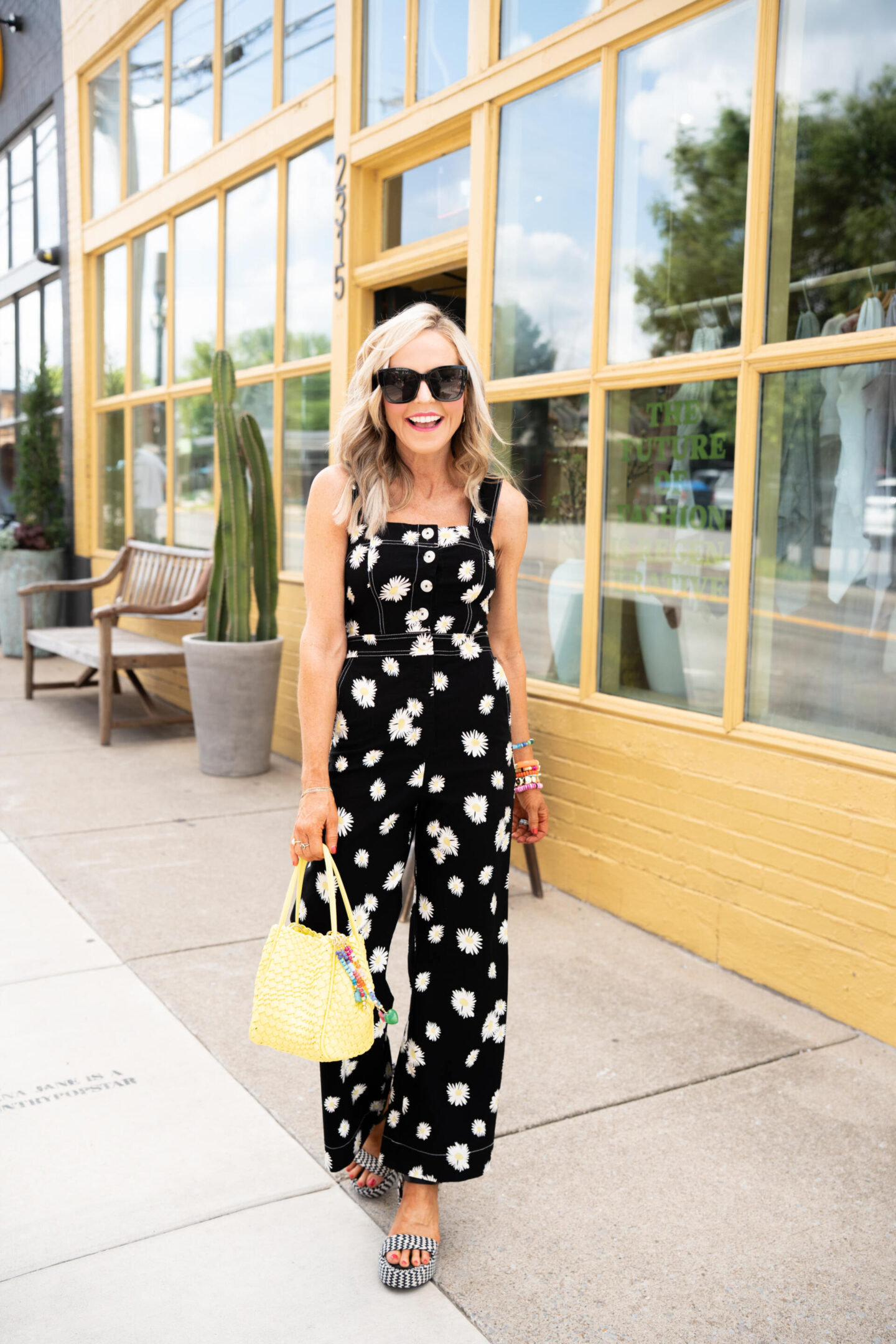 Back by popular demand… remember the Portside Button-Front Jumpsuit by Maeve [wearing size 0/ runs small in the bust] I styled last July with that adorable cherry print for my Color Crush: Tutti Frutti blog?? Y’all loved it, and I totally get why—it’s comfy, flattering and just plain FUN. SO… when I saw Anthro had brought it back for summer 2025 I in an all new daisy print, I knew it had to be mine because it’s giving sunshine on repeat! I paired it with the Hollace Tote: Woven Mini Edition in the happiest shade of yellow [in that bright bold hue I’ve been loving as of late] and added some gingham platform slides from Target and stacked rainbow bracelets to keep the look playful. This is an outfit that just makes you smile—and it’s Anthropologie with 20% off at its best!